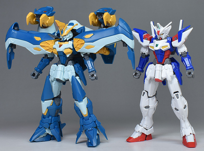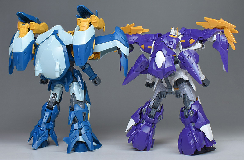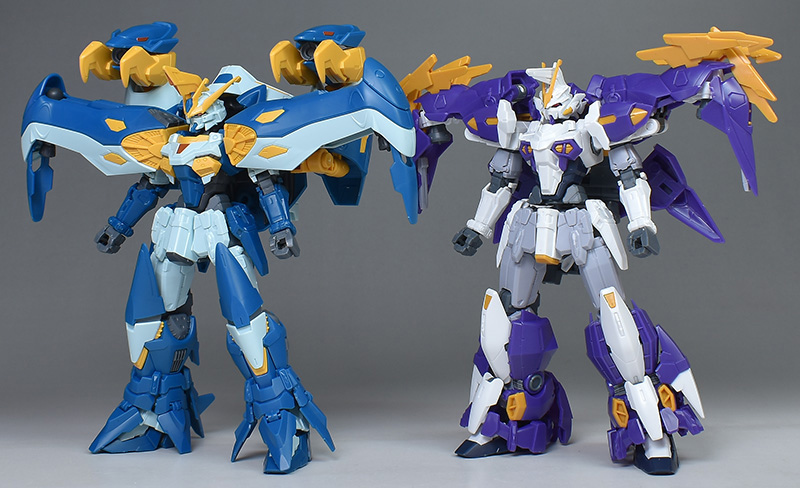 HGACガンダムアスクレプオスと並べて。造形的には各部が細かく違っていますが、ベース機なのでシルエットは結構似ています。どちらもヒロイックさとヒール感を併せ持つデザイン。