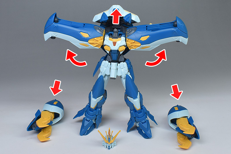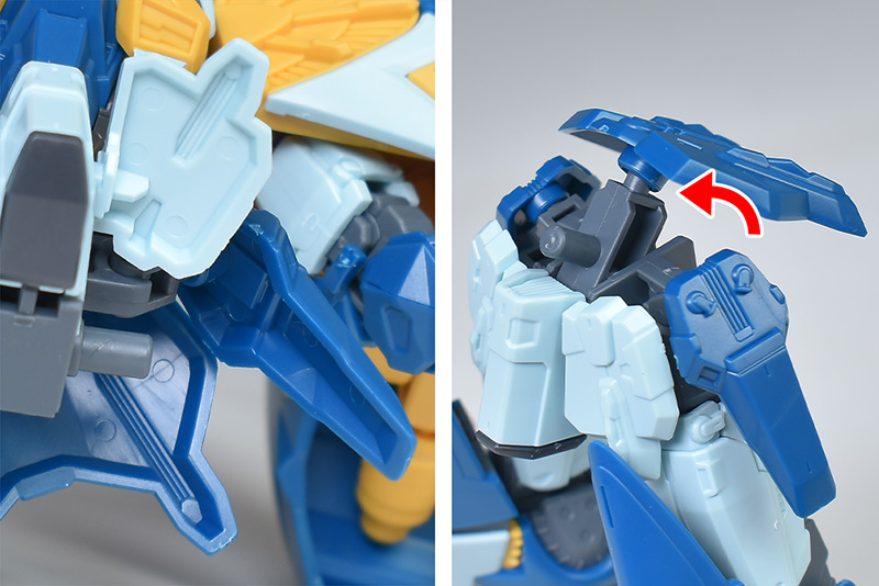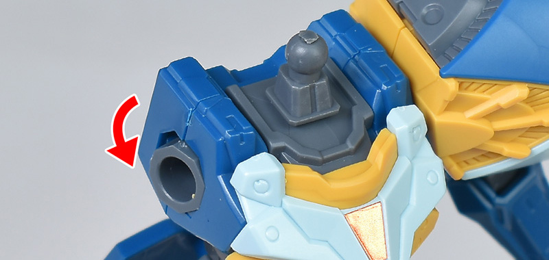 デュエルモードへの変形は、まず頭部と両肩のゴレムクローを外します。そして腕部をショルダーアーマー内部に収納。側面の装甲も閉じておきます。