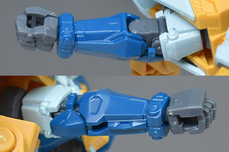 上腕は筒型パーツの組み合わせで合わせ目はなし。前腕も上下の組み合わせですが、合わせ目は段差モールド化されています。肘はヒンジパーツの組み合わせで組み立てやすい構造。