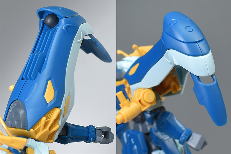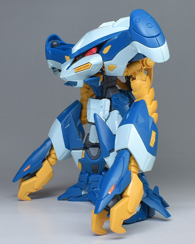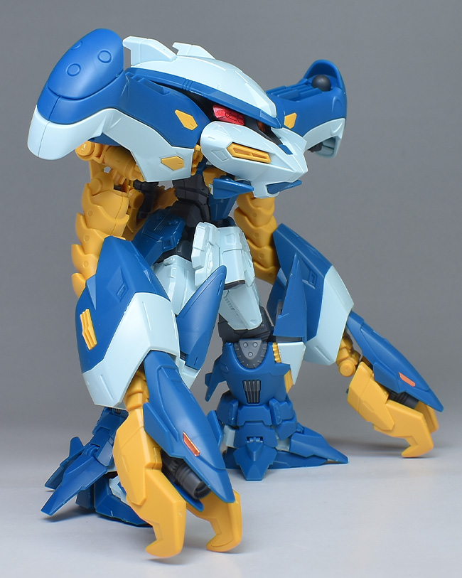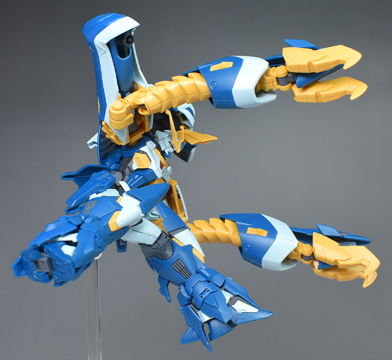 上部のクロー部分は角度変更が可能。クローや首の部分、ブルーグリーンの装甲などは左右の組み合わせですが、中央の合わせ目は段落ちモールド化されています。