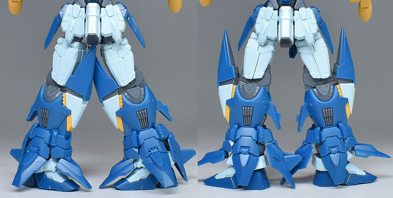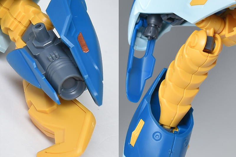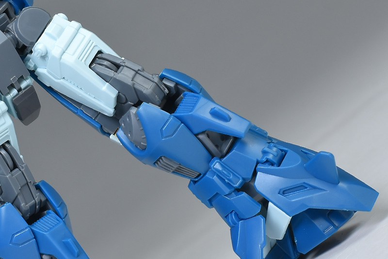 膝は2重関節である程度深くまで曲げることが可能。膝装甲裏もきっちりと裏打ちパーツで蓋がされています。膝周りの造りも申し分なし。