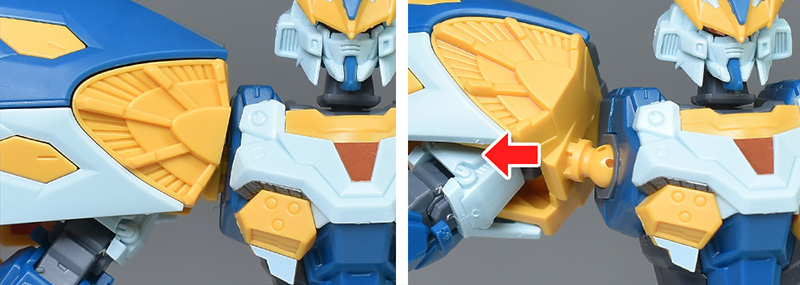 肩部はショルダーアーマーのボールジョイントを押し込んだ状態だと軸が差し込まれるため、ロックがかかって垂れない仕様になっていて、引き出すことでボールジョイントが付け根となり、柔軟に可動するようになっています。