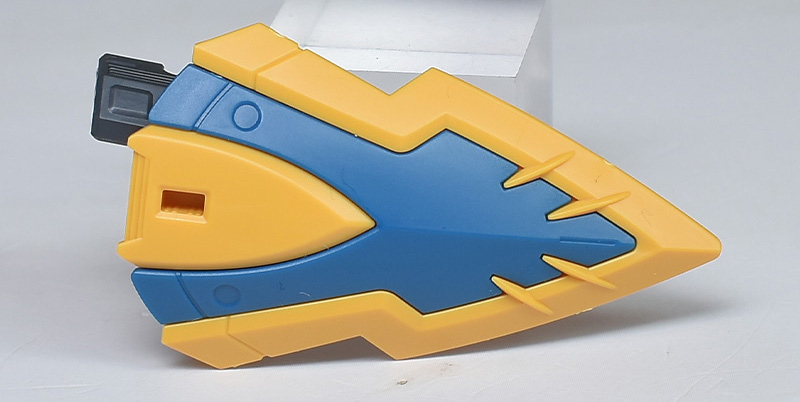 アサルト・ベイオネットの刃を反転させ、付属のジョイントパーツ、EMFシールドを組み合わせて背部に組み付けたら、デュエルモードへの変形完了です。