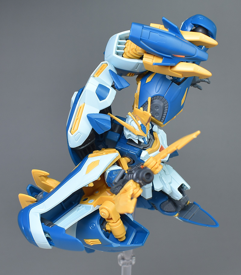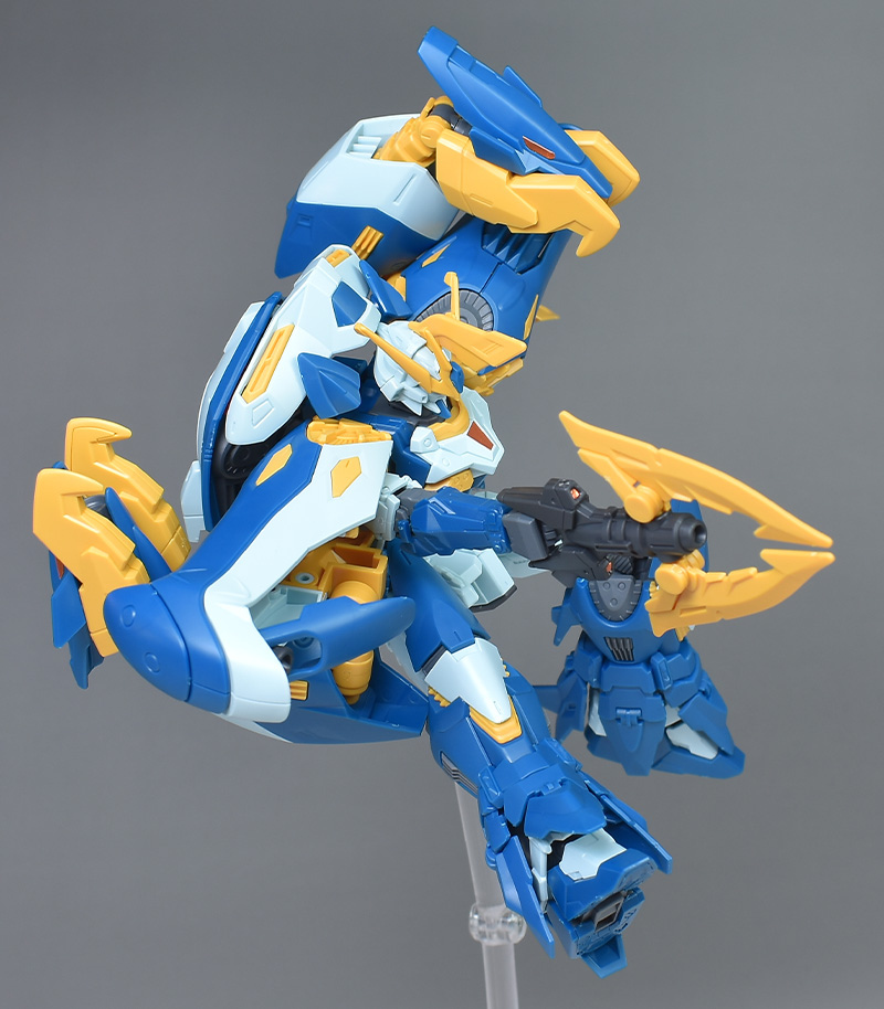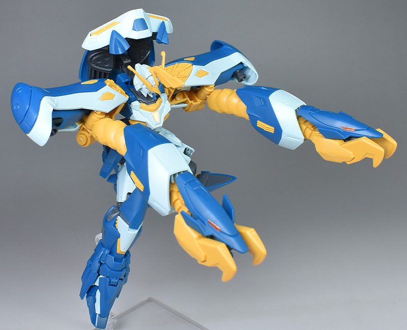 可動域の総括としては、多少各部装甲が干渉するため、可動が制限される箇所はありますが、各部に可動域が広がるギミックを仕込むなどより広く可動するようになっています。なので可動部をうまく活かすことで、ある程度動きのあるポーズは再現できそうですね。