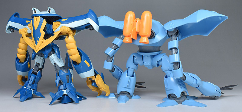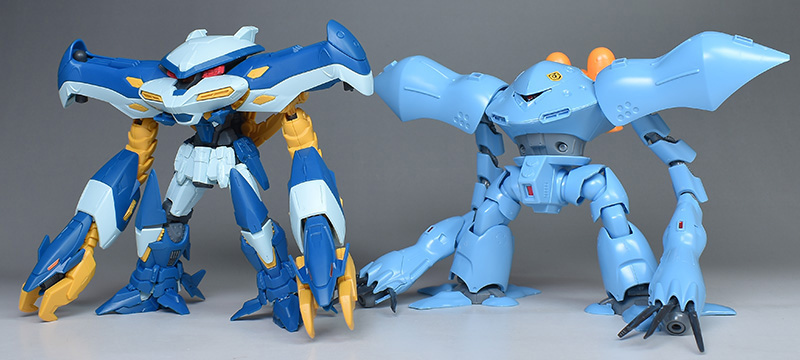 HGUCハイゴックと並べて比較。情報量に差はありますが、腕の長さや丸みのある頭部(胴体部)などシルエットはよく似ています。MS形態から変形するというギミックを交えつつもハイゴックらしい容姿がうまく再現されていると思います。