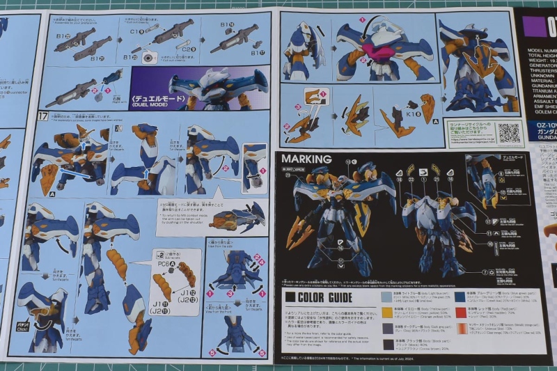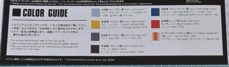 カラーガイド。色種、調色ともにまずまずです。基本的に合わせ目が段落ちモールド化されているので、後ハメなどの加工はあまり必要なさそうです。シールで色分けされている箇所はマスキングなどで塗り分けが必要。ツインアイも別パーツ化されていないので面相筆などで細かく塗り分ける必要があります。