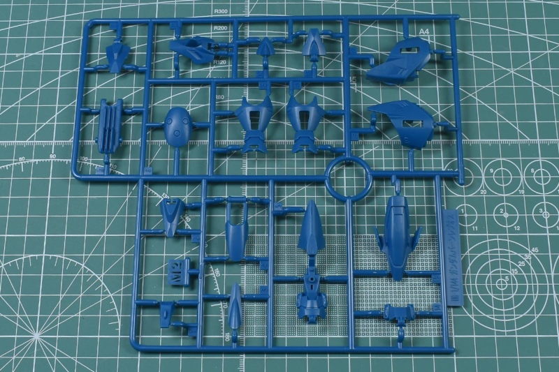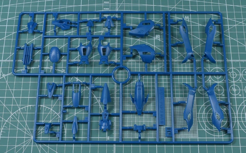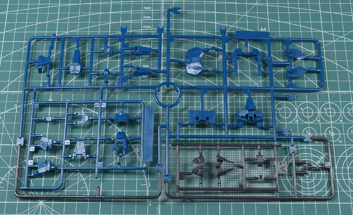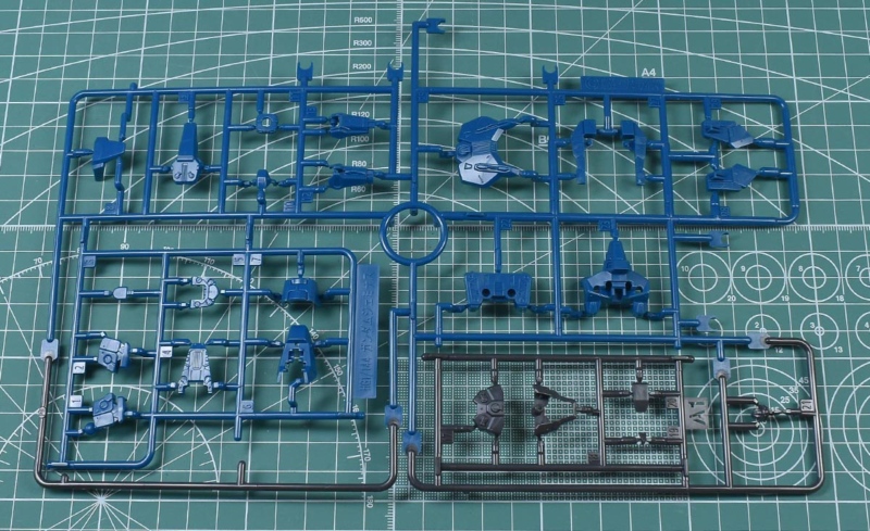 ↑A1ランナー。ブルーグリーンとダークグレーのイロプラランナーで、胴体部や上腕部、ソール部パーツなど。HGACガンダムジェミナス01からの流用ですが、上部や右側の胴体部パーツが省かれています。多分、このように取り除かれたパーツが部品注文の対称になるんでしょうね。