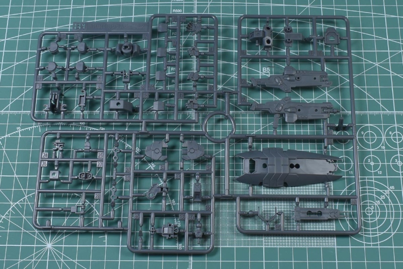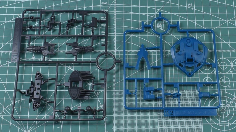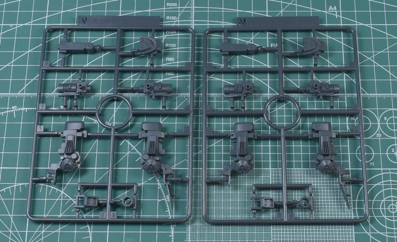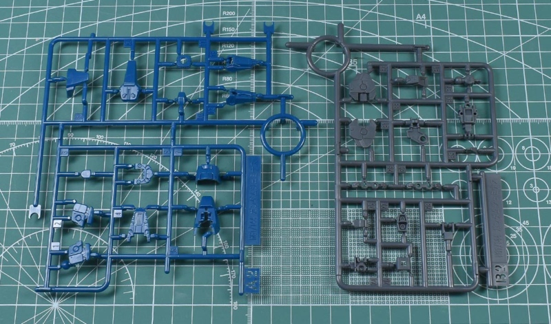 ↑K1、K2ランナー。K1はダークグレー成形色で、肩部や背部ユニット、アサルト・ベイオネットパーツなど。K2はブルーグリーン成形色で、頭部や背部ユニットパーツ、EMFシールドパーツ。KPS素材です。