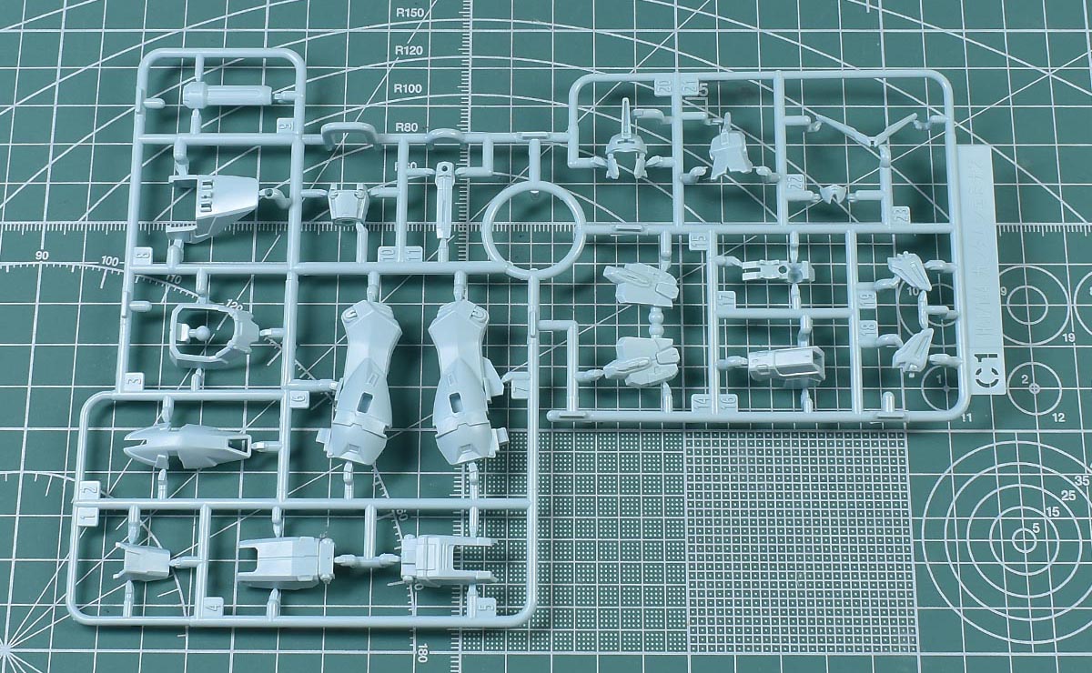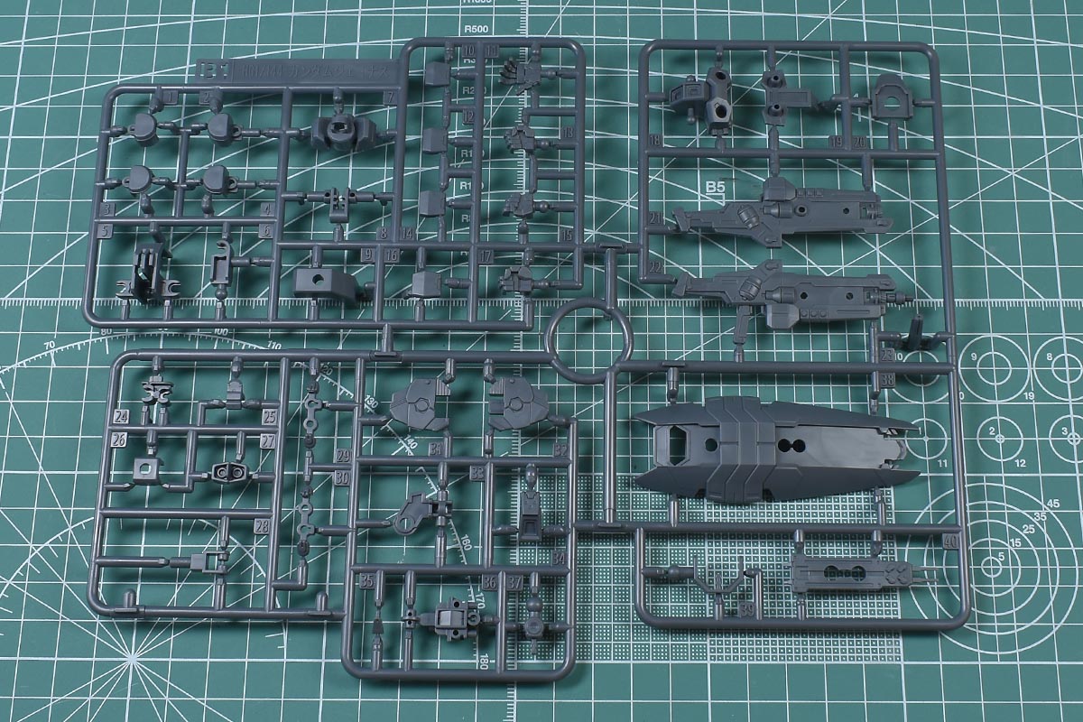 ↑B1ランナー。グレー成型色で、胴体部や腕部、脚部の内部・関節パーツ、アサルトライフルパーツなど。KPS素材です。HGACガンダムジェミナス01からの流用ランナー。