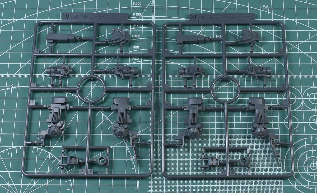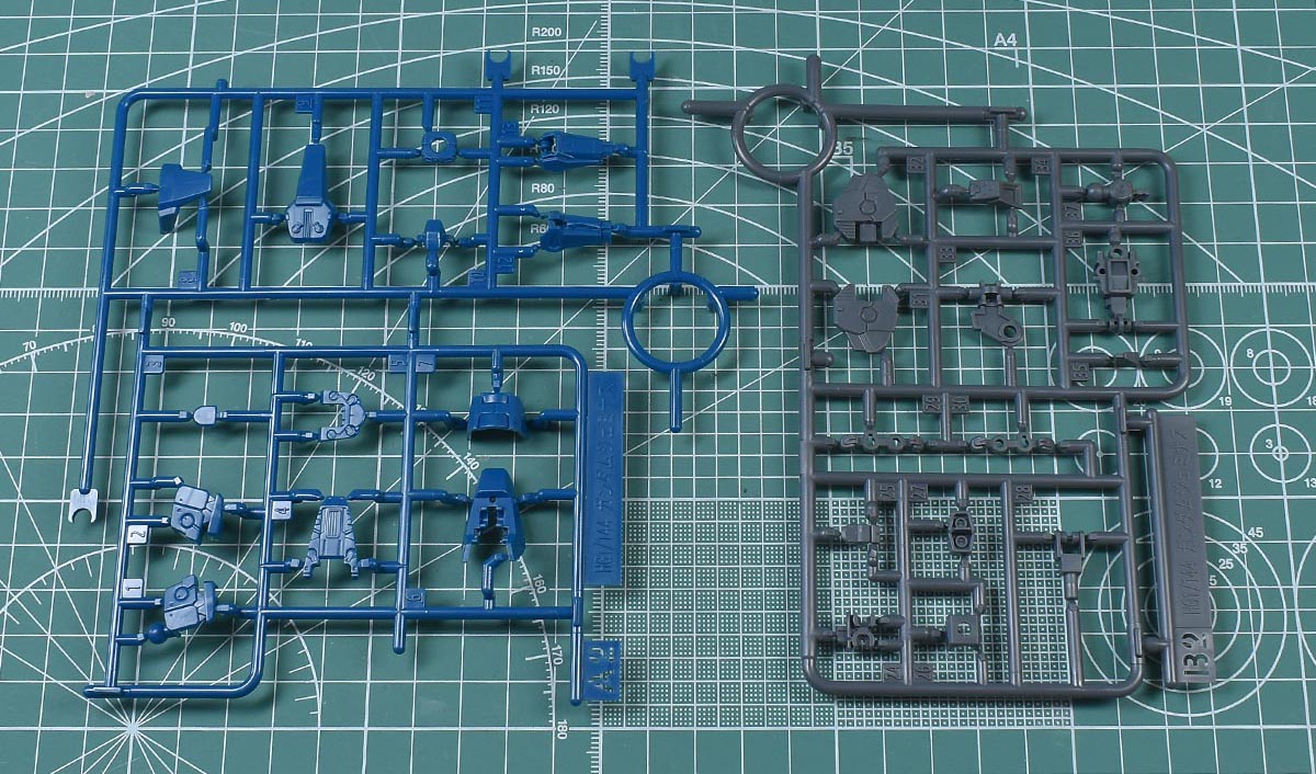 ↑A2、B2ランナー。A2はブルーグリーン成形色で、A1の一部と同じ。A2はグレー成型色でB2の一部と同じです。どちらもHGACガンダムジェミナス01からの流用ランナー。