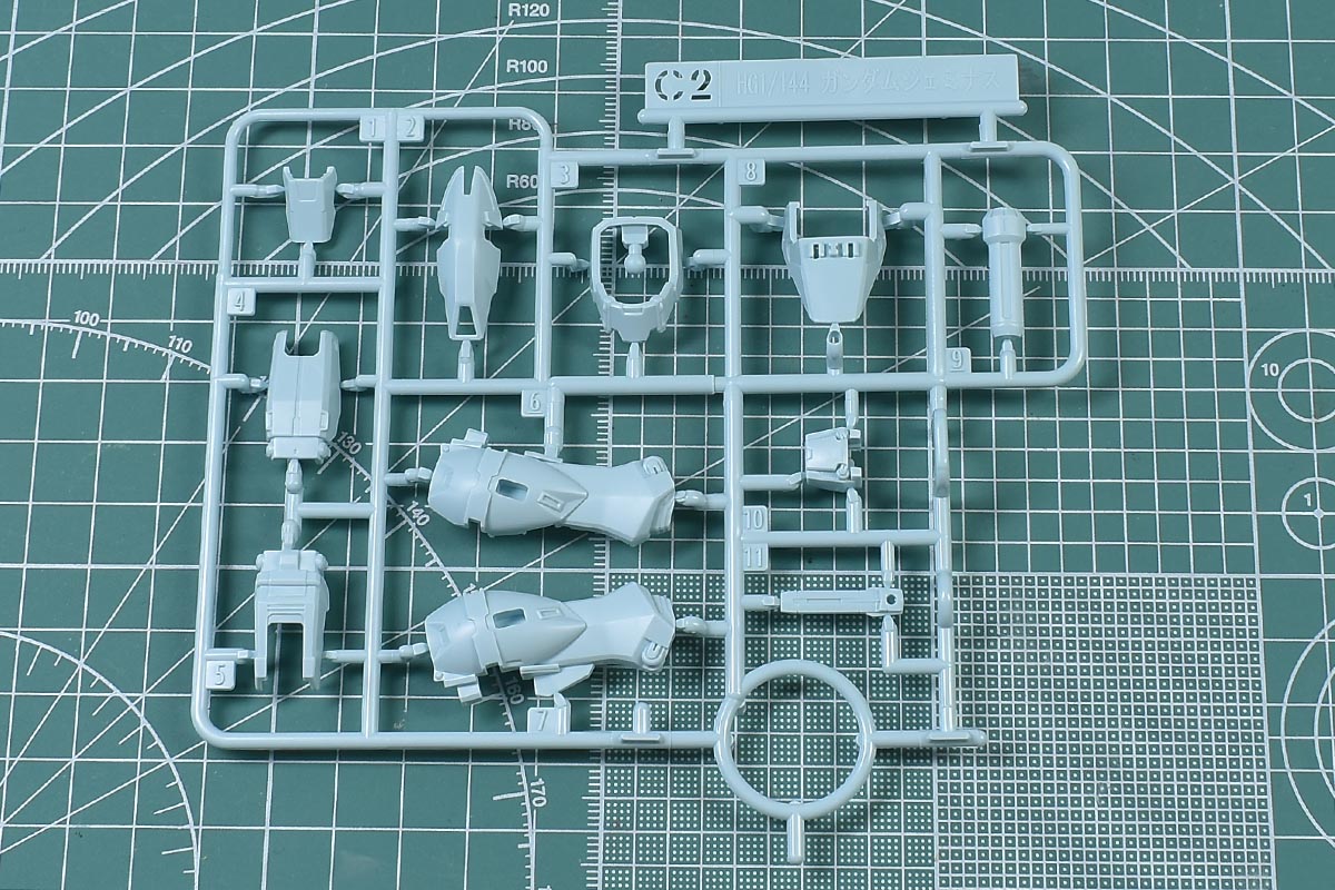 ↑C1、C2ランナー。ライトブルー成形色で、腰部や上腕部、大腿部パーツなど。HGACガンダムジェミナス01からの流用ランナーです。
