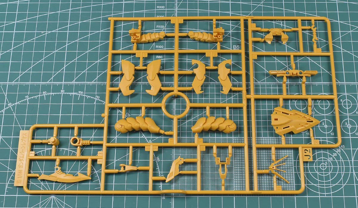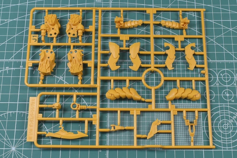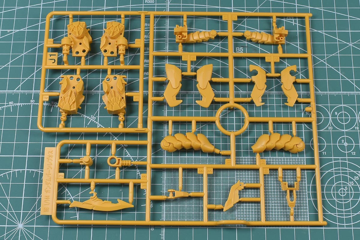 ↑J1、J2ランナー。くすみのあるイエロー成形色で、頭部や胴体部、肩部パーツ、ゴレムクローや背部ユニット、シールド、アサルト・ベイオネットパーツなど。KPS素材です。HGガンダムバーンレプオス用の新規ランナー、