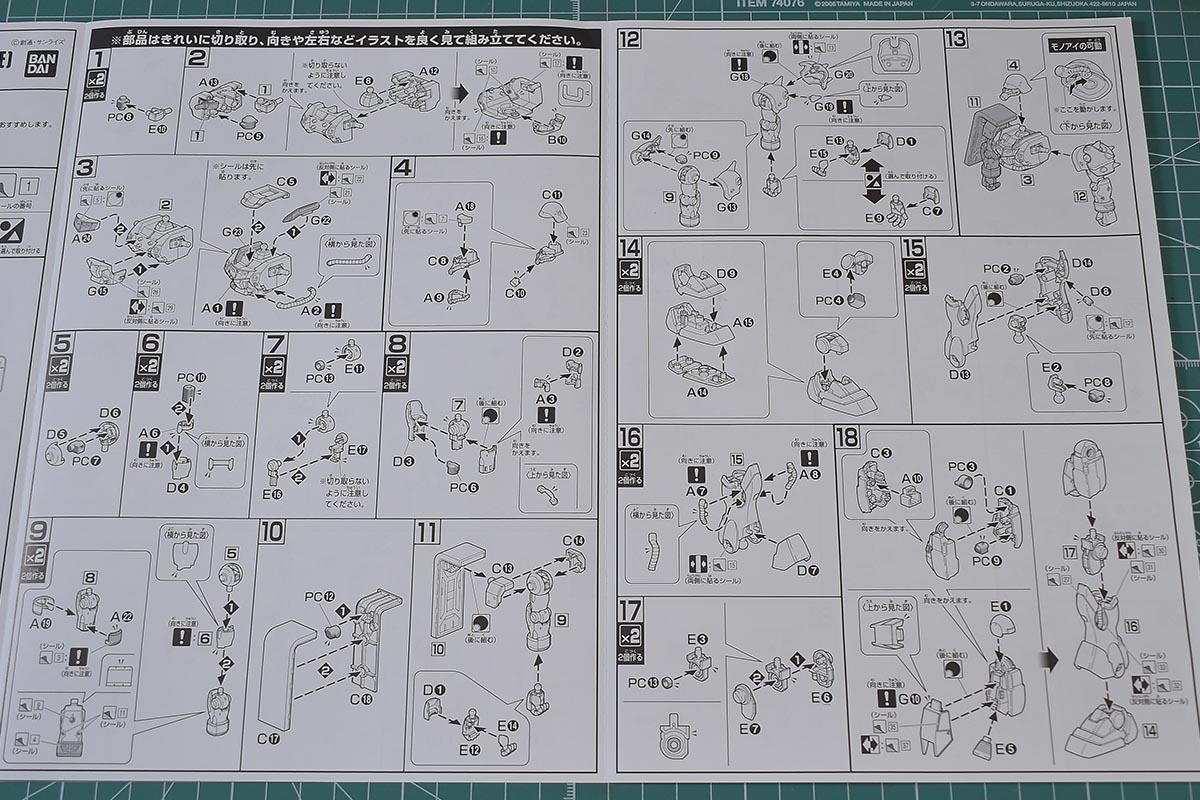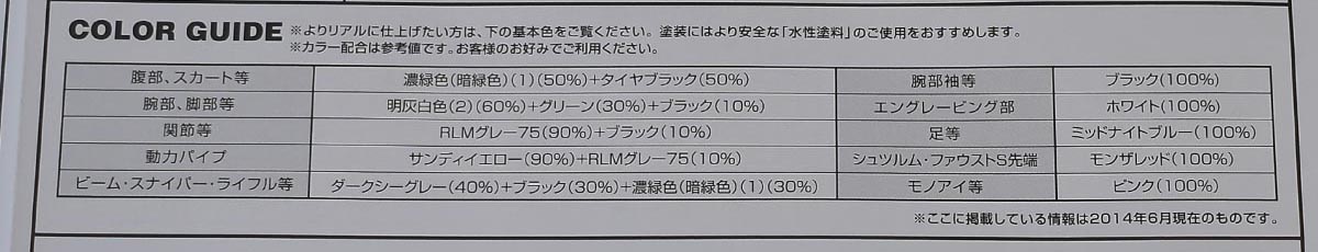 カラーガイド。見た目によらず色種は多め。ですが調色は1色のものも多く、比較的シンプルです。プレバン説明書は白黒なので、色の感じが掴めないのがちょっと残念かも。大味でも一般発売商品のように色見本があったほうがイメージはしやすいですね。