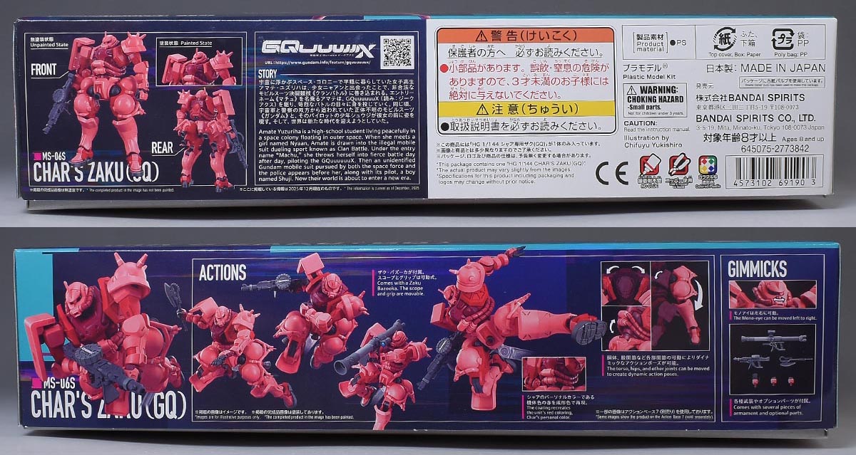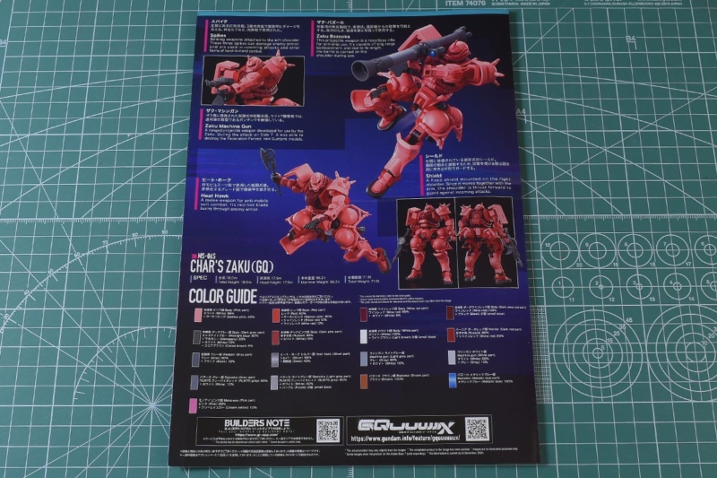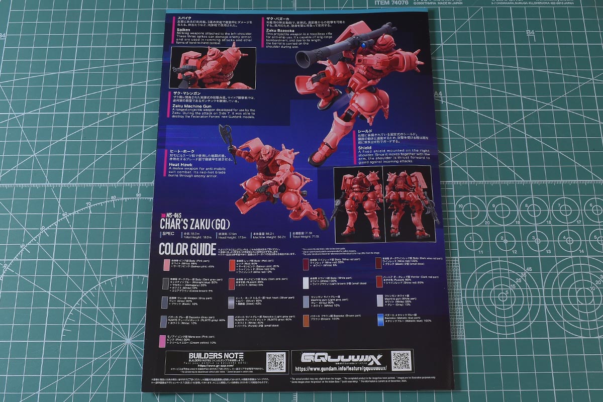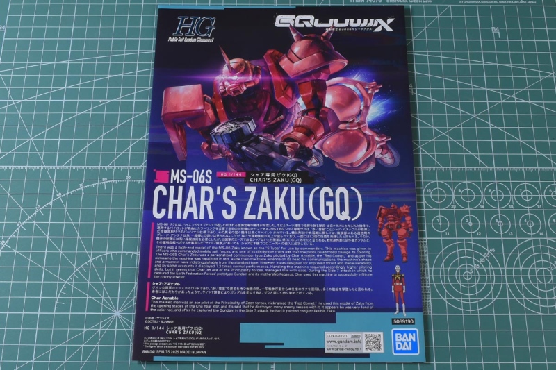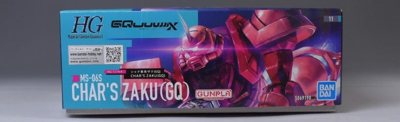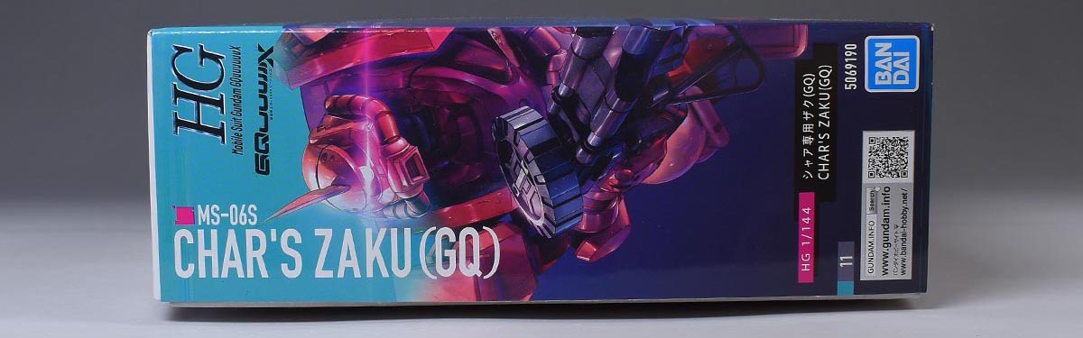 HGジークアクスシリーズなので、左右のイラストは縦置きと横置きが考慮された仕様。シャアザク(GQ)も例に違わずです。ナンバーは11。白いガンダム(12)と同日発売ですが、ラインナップ的にシャアザクのほうが先発となっています。