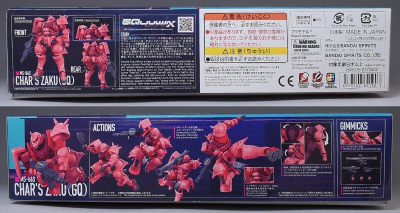 パッケージ側面にはシャアザク(GQ)の多数のポージング画像が掲載されています。見た目によらず良く動きますし、迫力あるアクションポーズが繰り出せるようになっています。それに赤いシャアカラーと指揮官機アンテナで訴求は完璧。