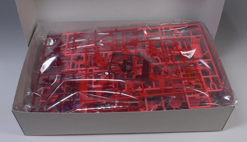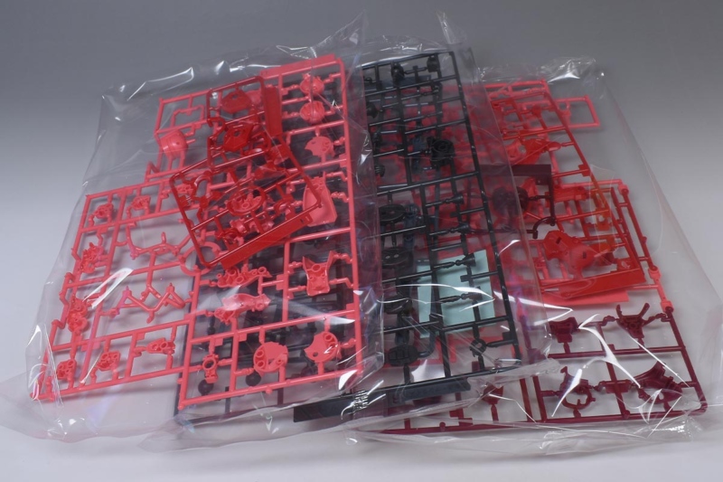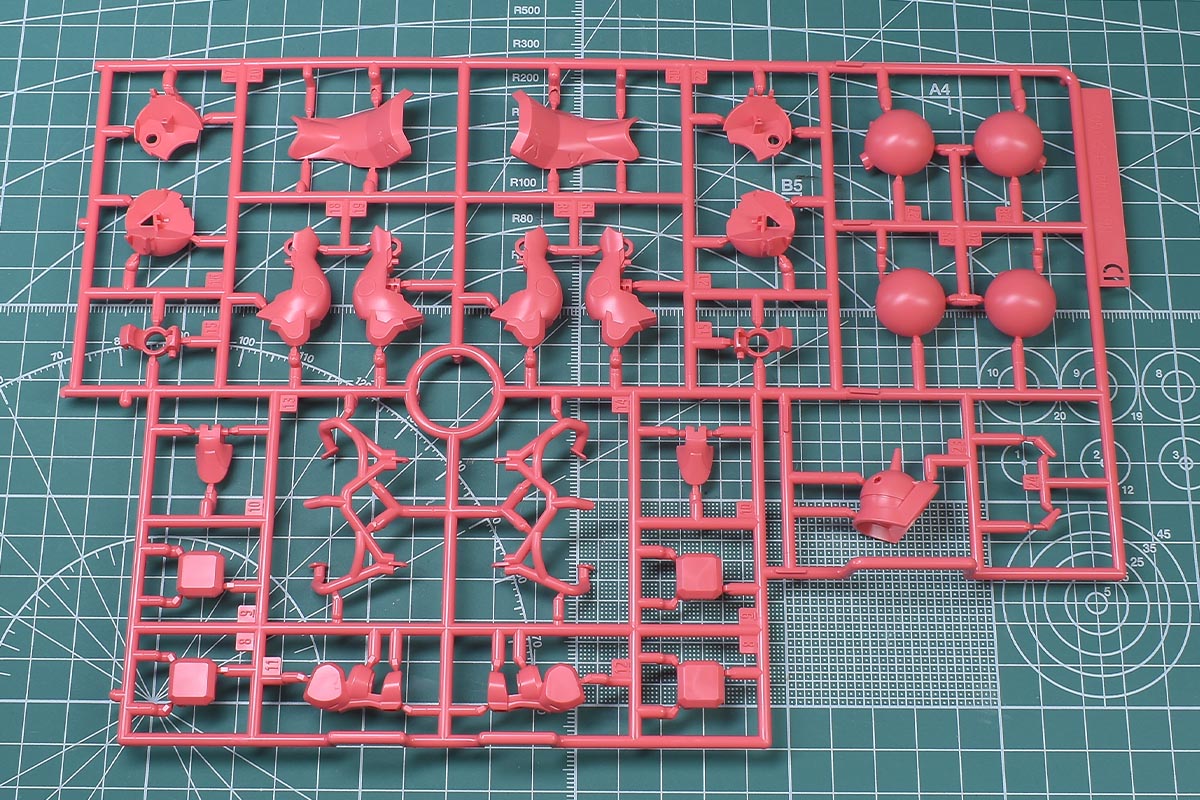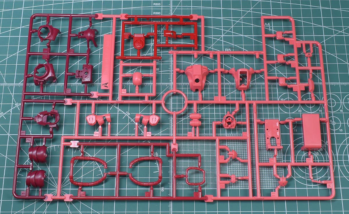 ↑Aランナー。ピンク、レッド、ダークレッドのイロプラランナーで、頭部や胴体部、腕部外装パーツ、L字シールドパーツなど。HGザク(GQ)からの流用ランナーです。