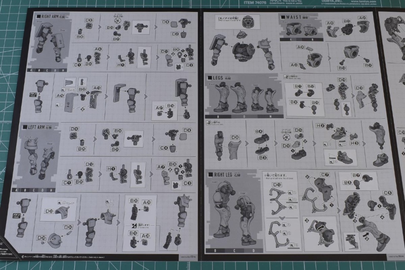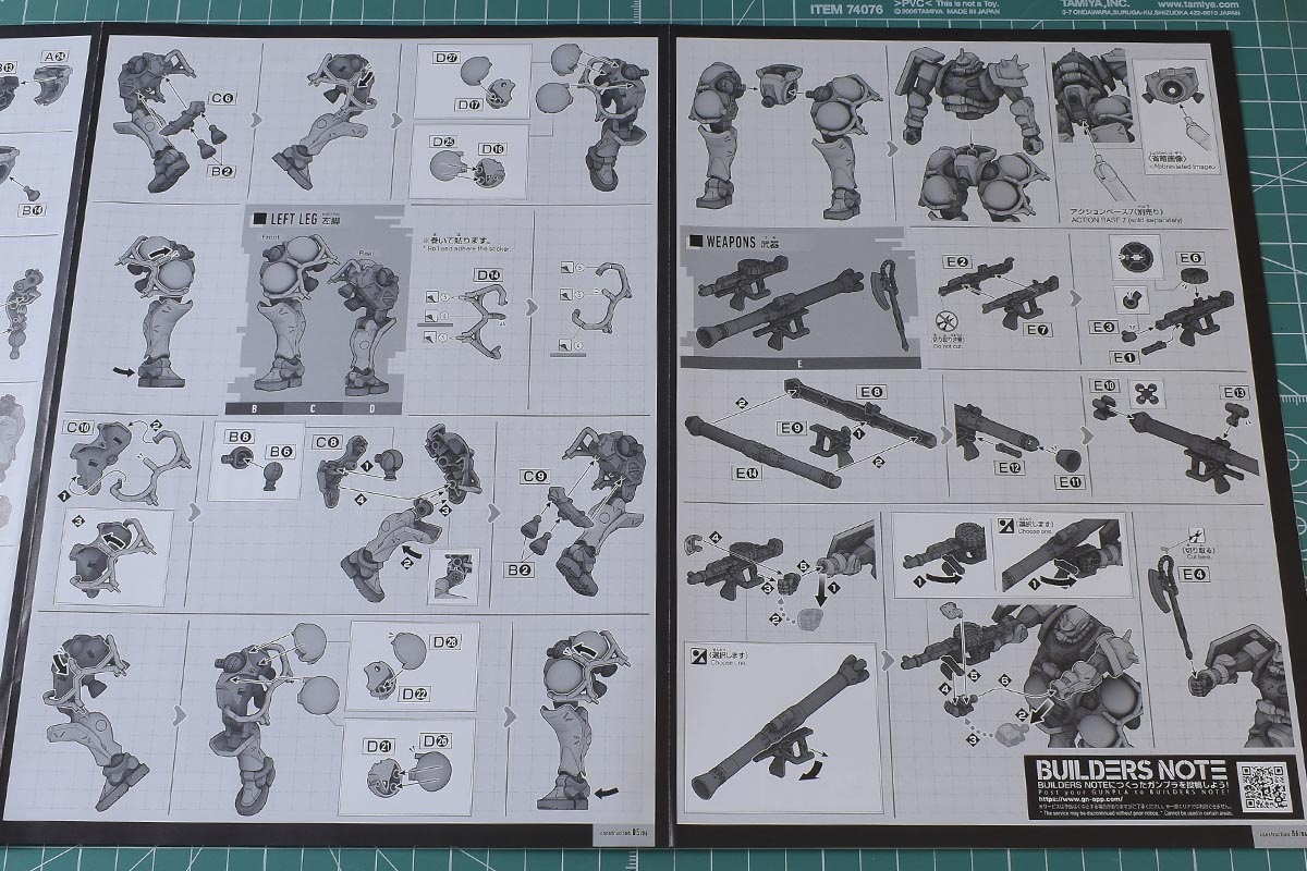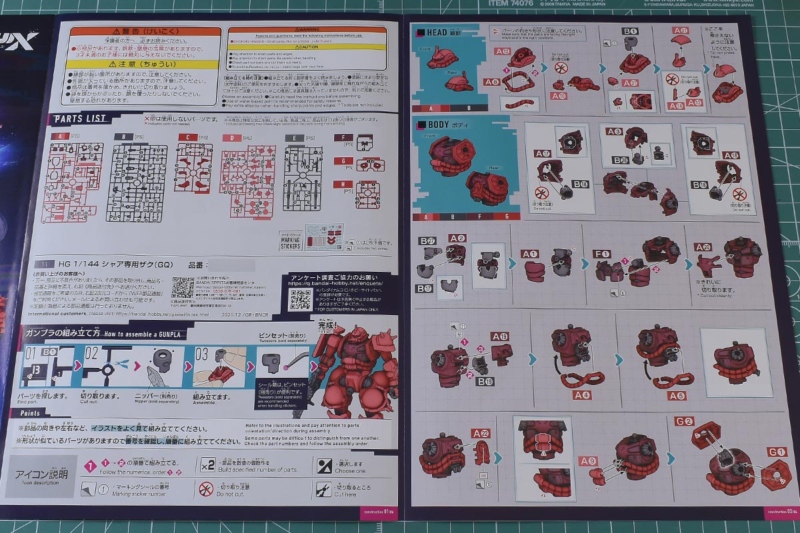 以上、説明書でした。基本的には軍警ザク、ザク(GQ)、シャアザク各種とも構造は同じ。大腿部周りなどは構造が特殊ですが、全体的に色分け再現度が高く、且つ合わせ目が極力出ない造りになっています。ランナーも部位ごとにパーツがまとめられているので探しやすく、組み立てやすいのもこのキットの利点。