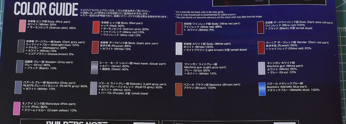 カラーガイド。調色はそれほどでもないですが、色種がとにかく多いです。キットを見るとどこの色ですか?という感じですが、ガイドのとおり、細部まで丁寧に塗り分けるとかなり印象が良くなりそうです。・・・マーキングシールの色味まで塗装で再現しろと・・・?