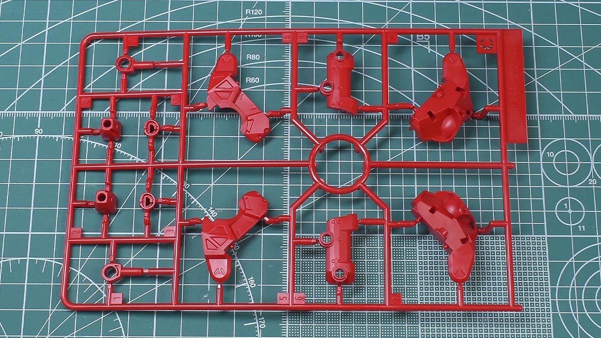 ↑Cランナー。レッド成形色で、腕部や脚部内外パーツ。こちらもHGザク(GQ)からの流用ランナーです。HG軍警ザクからだと右側のシールドパーツが省かれています。