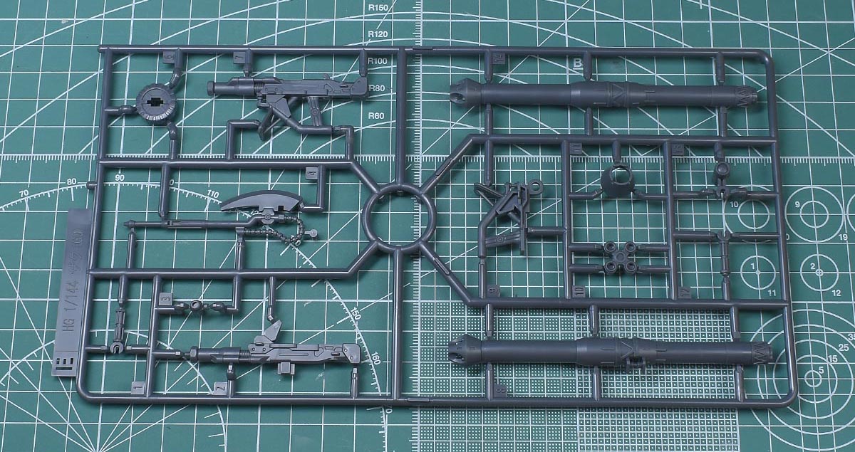 ↑Eランナー。グレー成型色で、ザク・バズーカやザク・マシンガン、ヒート・ホークパーツ。KPS素材です。こちらもHGザク(GQ)からの流用ランナー。