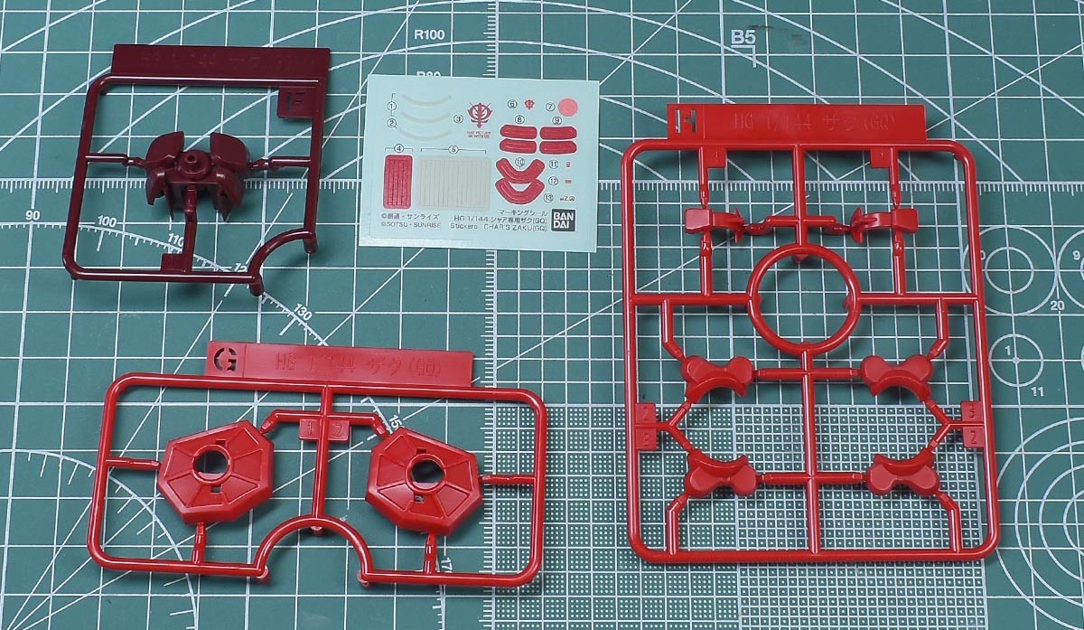 ↑F、G、Hランナー、マーキングシール。Fはダークレッド成型色の胸部パーツ。Gはレッド成形色の肩部パーツ。Hはレッド成形色の腕部と脚部パーツです。各ランナーともHGザク(GQ)からの流用。
