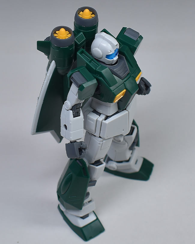 頭部。ジムスロープは特にマーカーポッドなどの装飾がなく、無駄のないシンプルなスタイルになっています。とさか前後のセンサーは青いシールでの色分け。