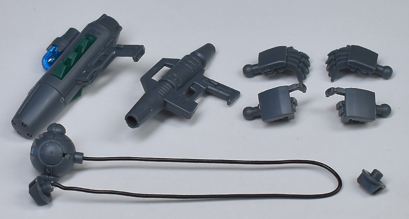ソナーガン、ビームスプレーガン、センサーポッド(センサーポッド本体✕1、リード線1本、ジョイントパーツ✕2)※2、ハンドパーツ(平手:左右、武器持ち手:左右)が付属。※2 センサーポッドもう1基はアクア・パックにマウントされています。