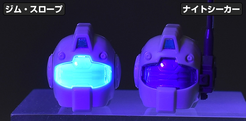 クリアブルーのバイザーは、ナイトシーカーは反応しませんが、ジム・スロープはブラックライト(UVライト)で照らすと鮮やかに発光します。