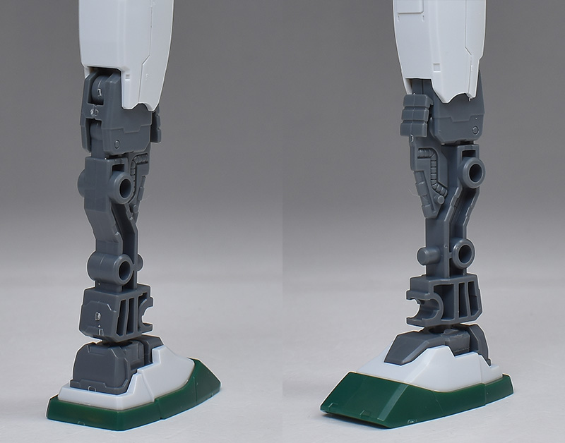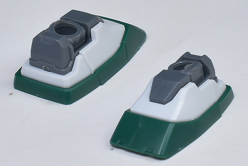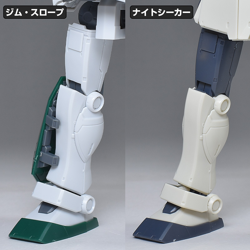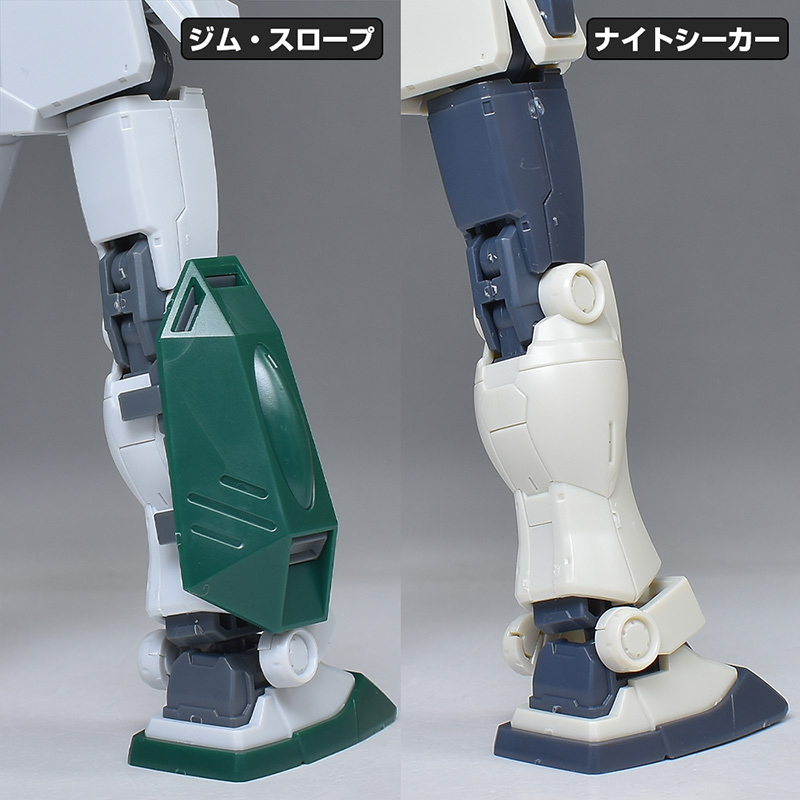 脚部。大腿部や膝から下はナイトシーカーと同形状ですが、側面にはジム・スループの特徴である補助バラストタンクを装備。水中航行も兼ねた特徴的な機体形状が再現されています。