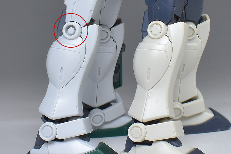補助バラストタンクは脱着が可能。脚部パーツは基本的にナイトシーカーからの流用ですが、膝から下の外側装甲のみジム・スループ用に新造。補助バラストタンク脱着用に膝の丸モールド(赤◯)が深穴になっています。