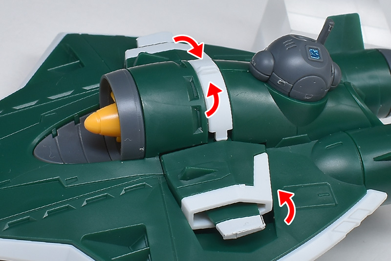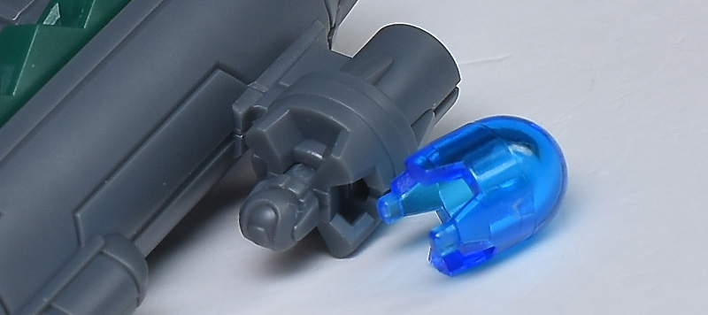 アクア・パック中央部にはセンサーポッドと水中翼を装備。中央の白い装甲パーツは裏面から回し込むように組み付けますが、組み付けが少し難しいので破損させないように注意です。