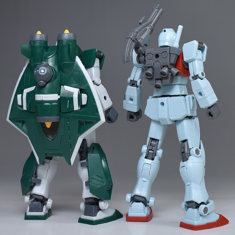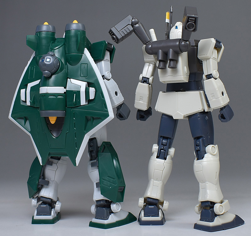 HG ジム (ショルダー・キャノン装備/ミサイルポッド装備)と並べて比較。同じMSDシリーズのジムですが、細部を見ると結構違っています。開発系譜のルートの違いを感じさせますね。