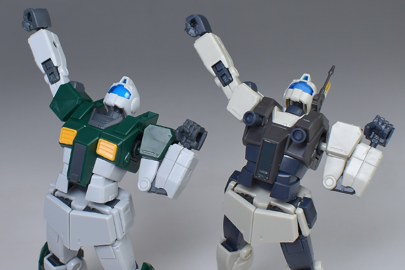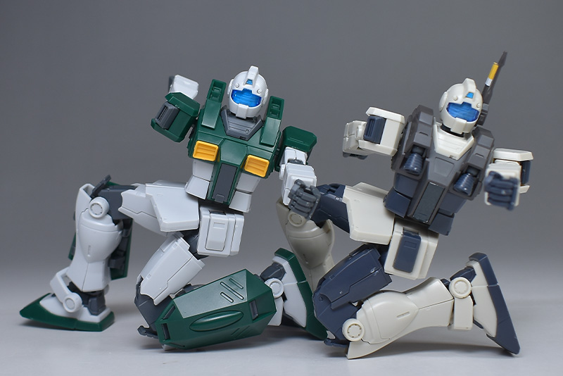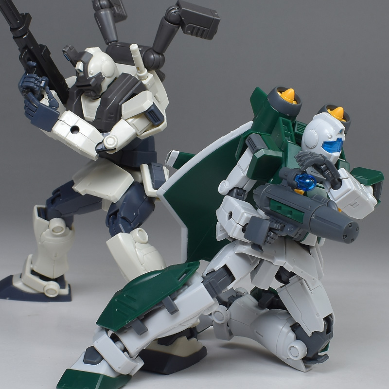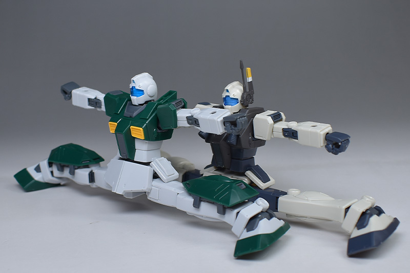 同フォーマットのHGジムナイトシーカーと並べて。素ジムをもとに、任務によって装備が変えられているため、同形状の部分もあれば異なる部分もあります。ですがどちらも特殊部隊らしい容姿で個性的です。