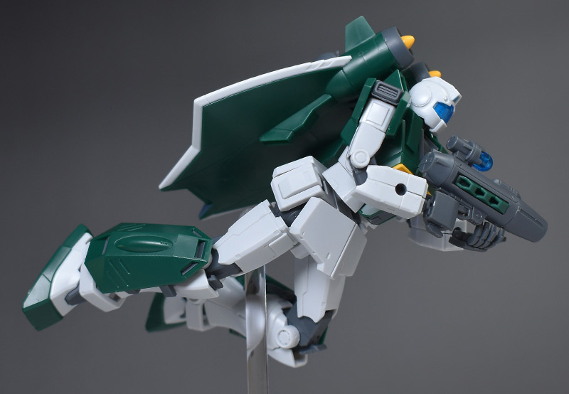 左右への開脚も水平まで幅広く展開させることができます。足首も深くまで曲げることが可能。ガンプラの中ではトップクラスくらい、全体的にかなり柔軟に可動します。ポージングの自由度も高そうですね。