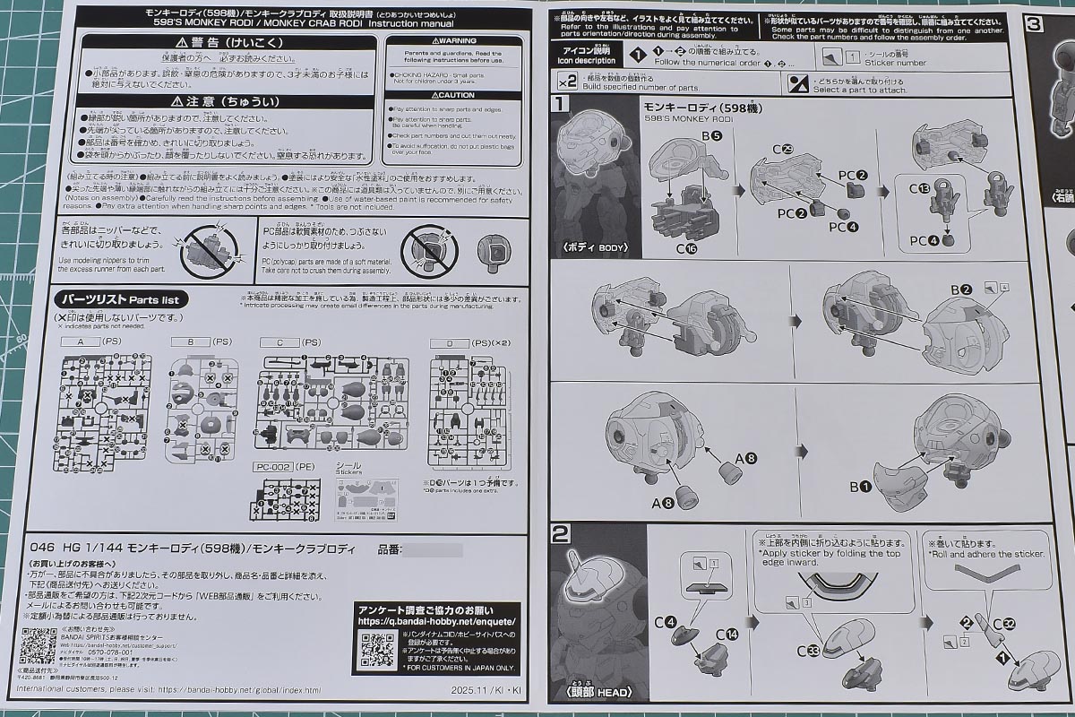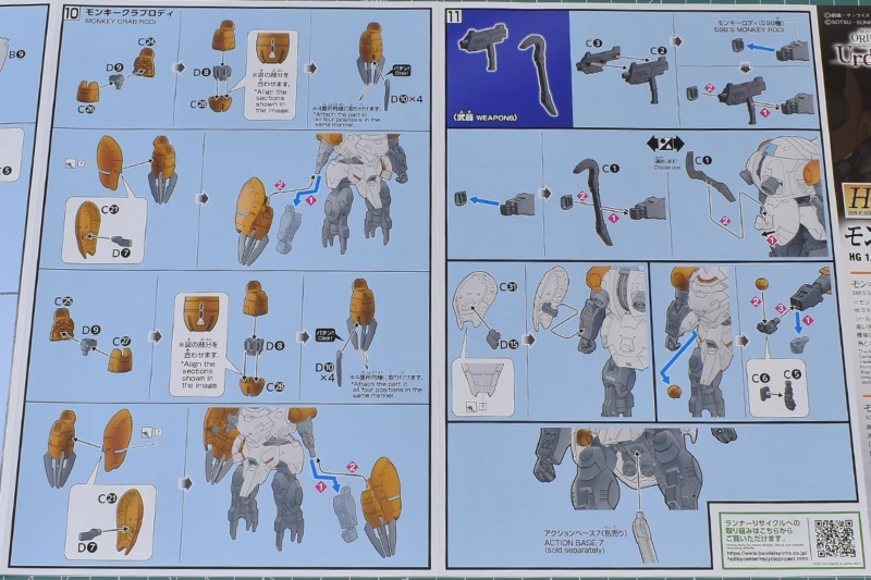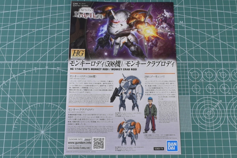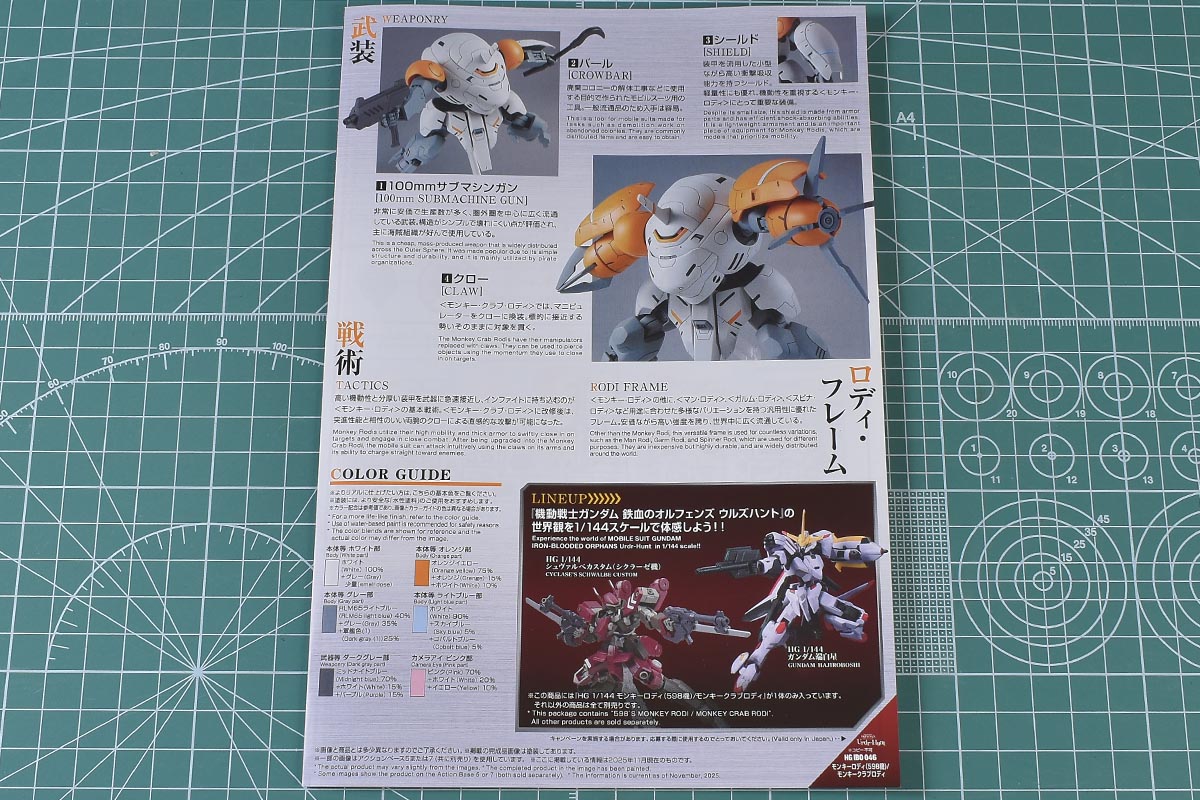 HG鉄血のオルフェンズシリーズなので説明書は小判A5サイズ。表紙にはモンキーロディ、モンキークラブロディ、そしてパイロットである598(ゴーキュッパ)についての解説があります。何気にネットに情報が少ない機体とキャラクターなので解説があるのはありがたいですね。