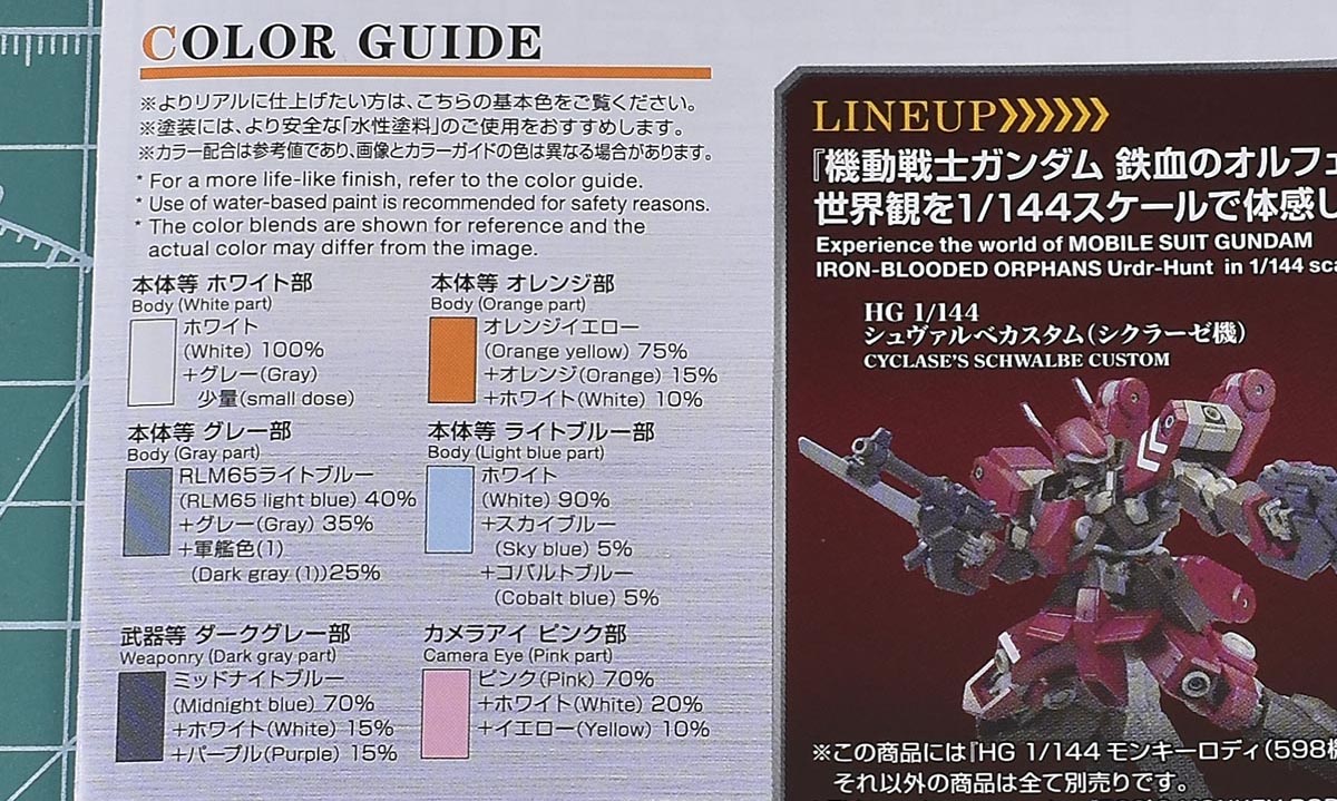 カラーガイド。色種自体は多くはないですが、どの色も3色以上の調色でかなり細かいです。塗装する場合、シールで色分けする箇所があるため、そのあたりをマスキングで塗り分ける必要があります。武装類など一部に合わせ目もあるのでそのあたりの処理は必要。ですが全体的にそこまで塗装に手間がかかる感じではないかなと思います。