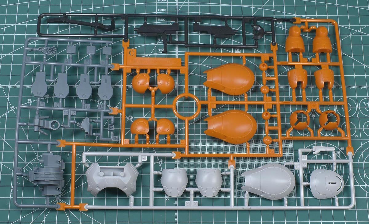 ↑Cランナー。くすみのあるホワイト、オレンジ、グレー、ダークグレーのイロプラランナーで、頭部や胴体部、腕部、脚部パーツ、モンキークラブロディ用の腕部など。グレー成型色パーツはKPS素材です。以下、HGモンキーロディ(598機)/モンキークラブロディ用の新規ランナー。