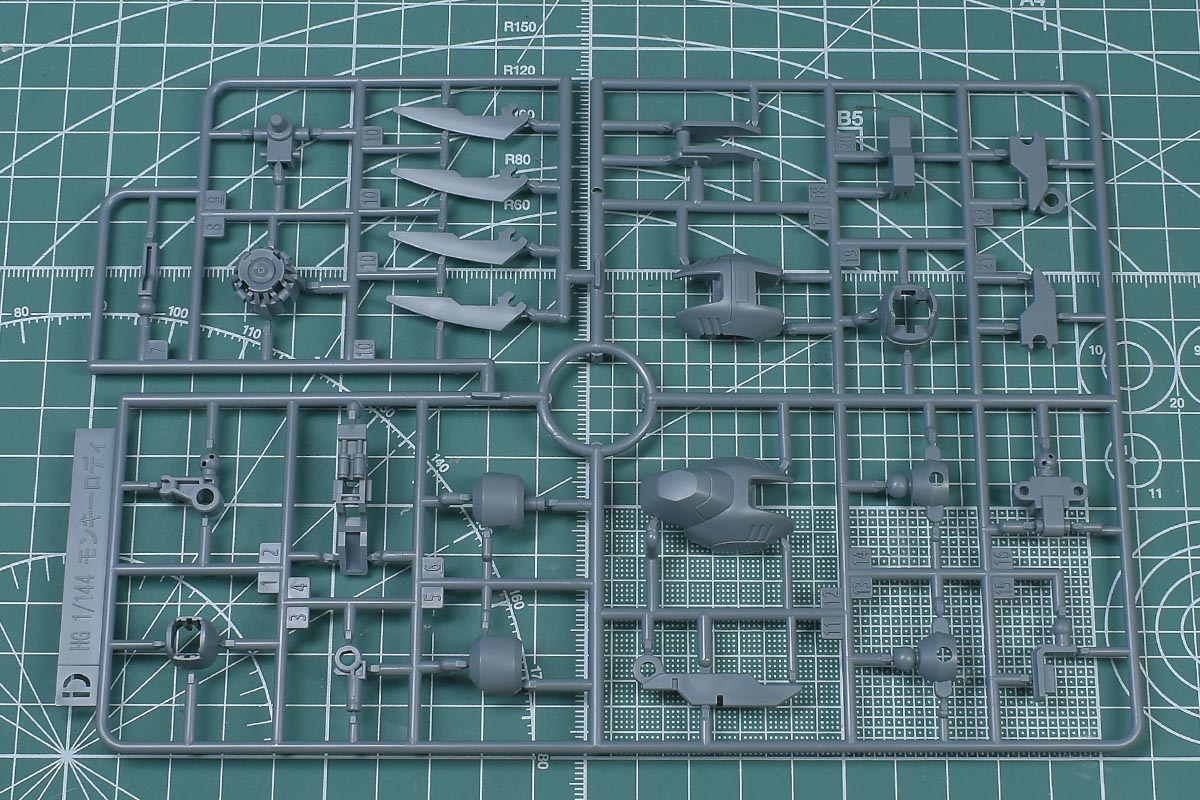 パッケージサイズは一般的なHGよりも高さが1cm程度大きめ。モンキーロディはHGとしてはやや小柄ですが、全体的に肉厚なのと、モンキークラブロディ用のクロー腕部が付属していること、マンロディの余剰パーツが多数付属していることから、このボリュームになっているのかなと思います。