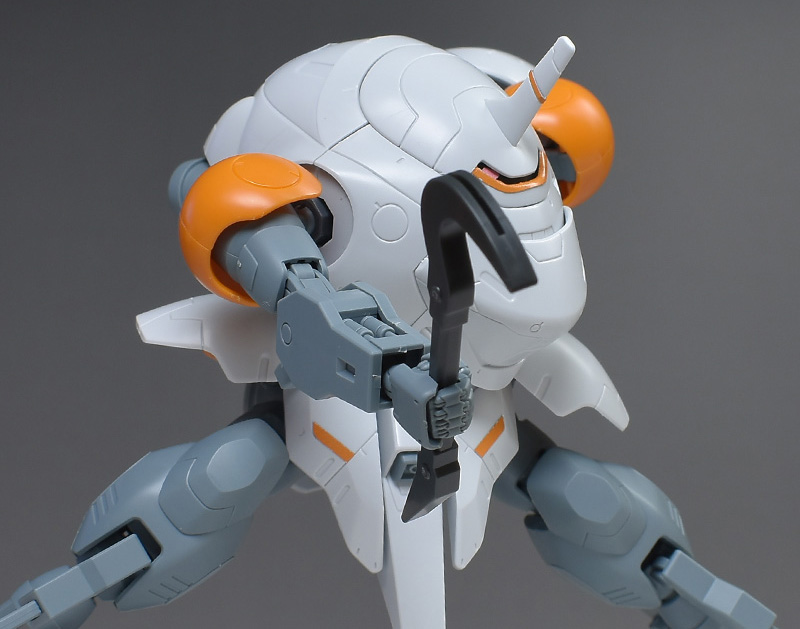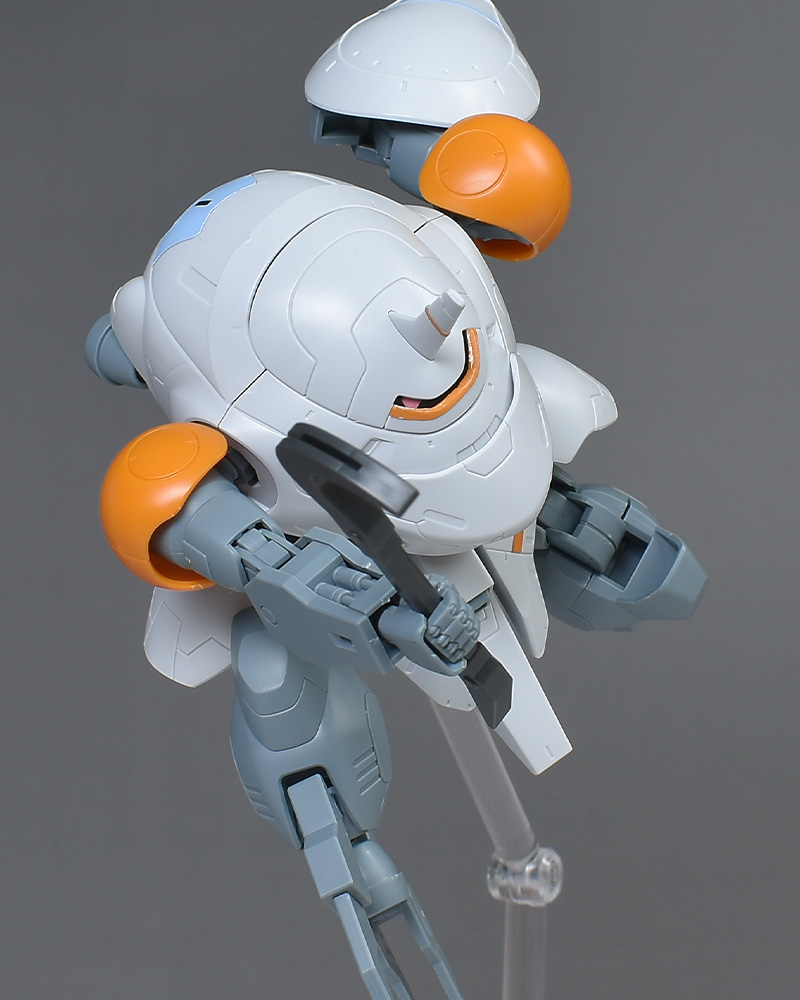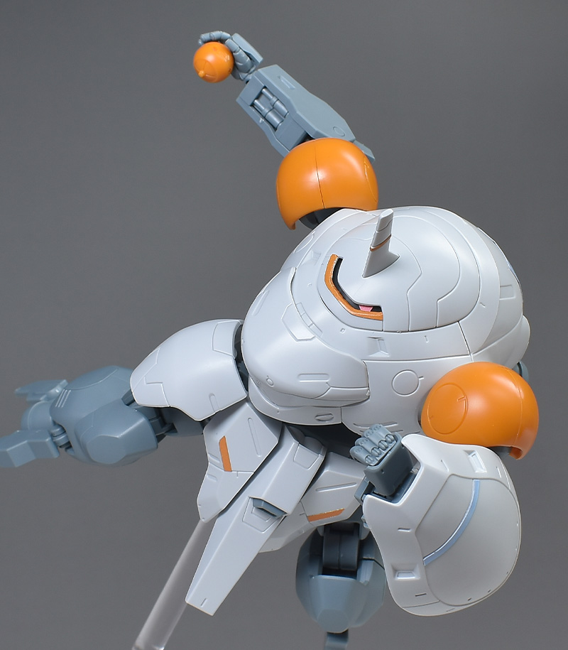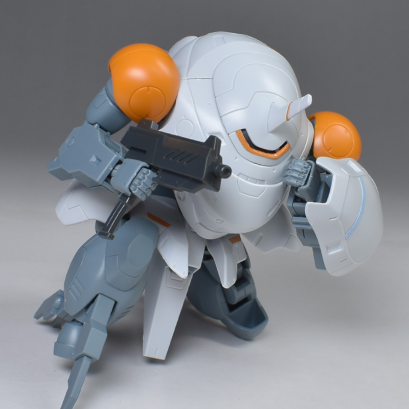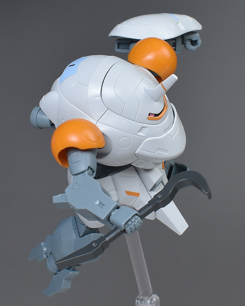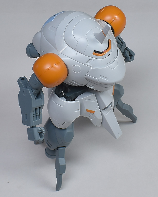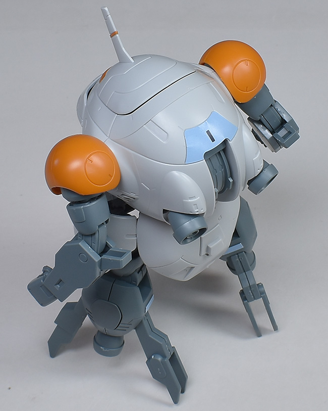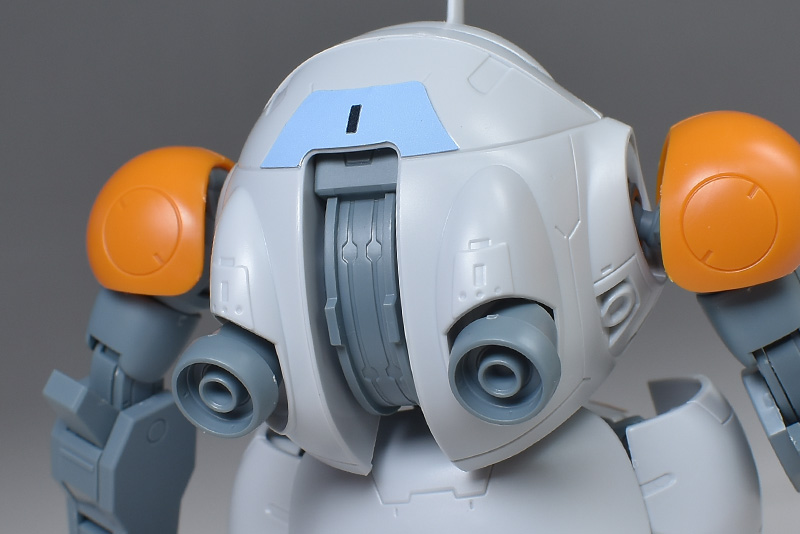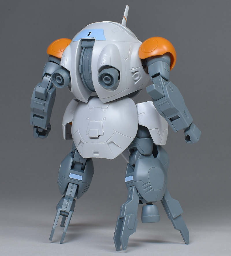 以上です。ホワイトとオレンジのカラーリングがマンロディベースの丸く可愛らしい容姿とうまくマッチしていますし、新造された箇所も造りがよく、細部まで丁寧に造形されています。小柄なキットでもモノアイの可動ギミックもしっかりと再現されていますし、シールド裏のモールドや腕部、脚部などの造りも細かくて良いですね。
