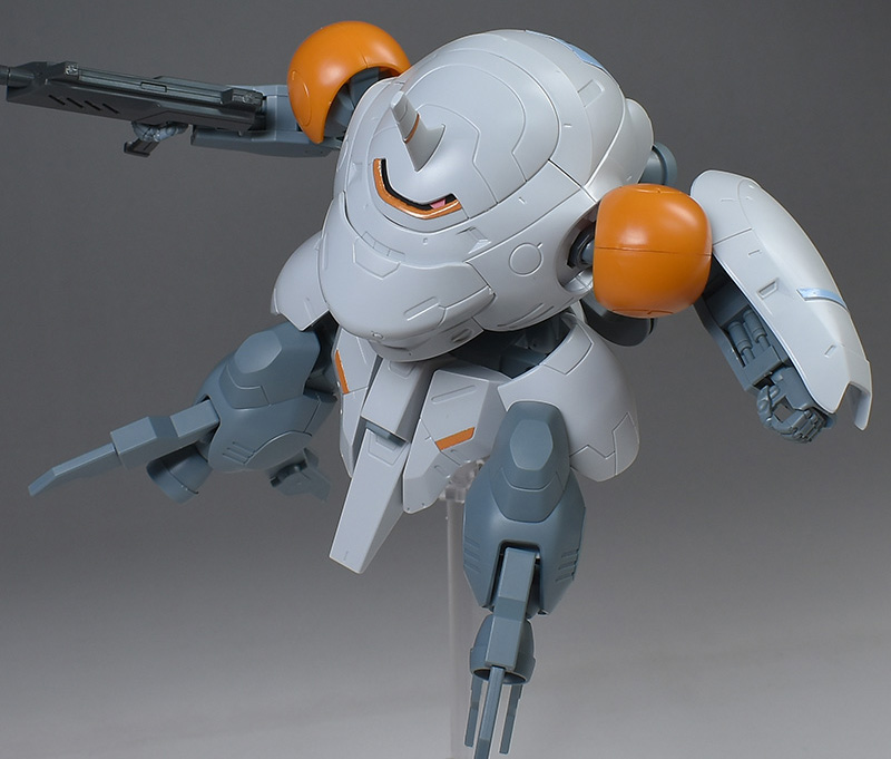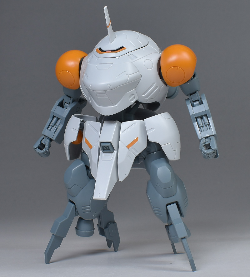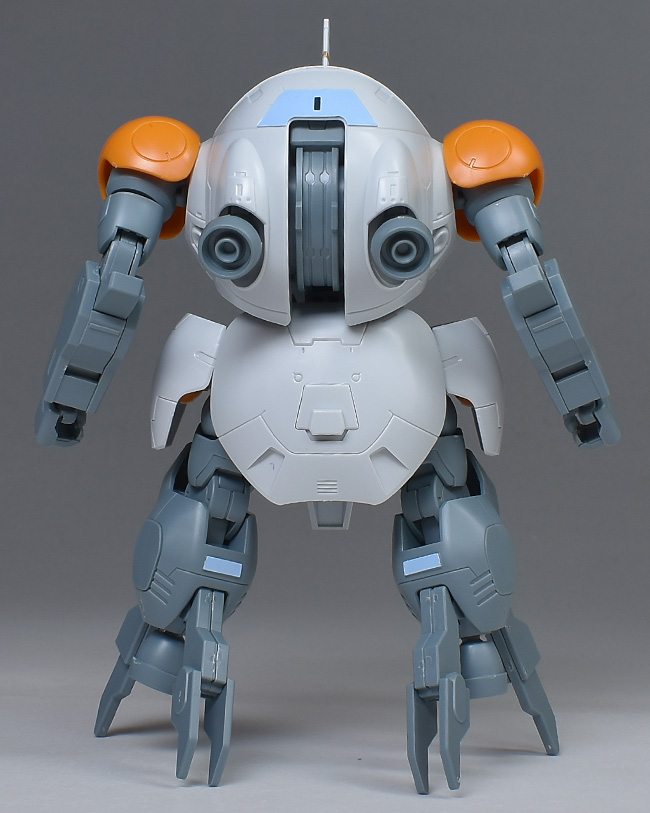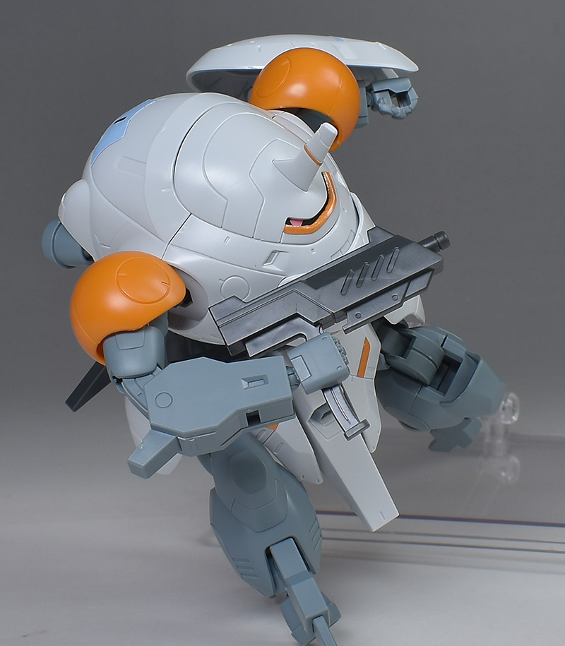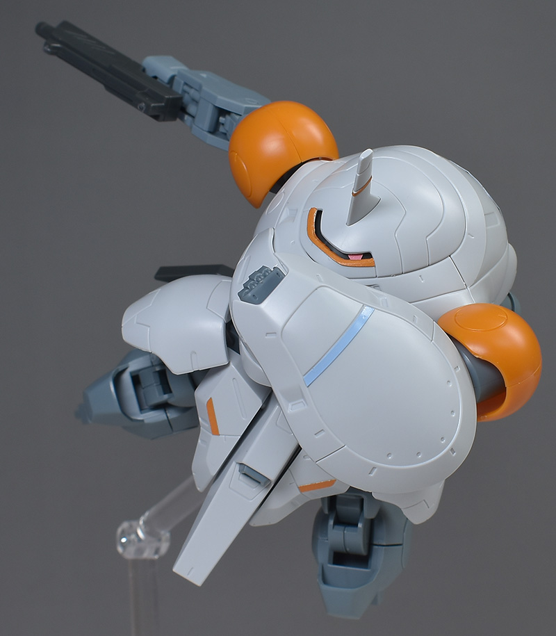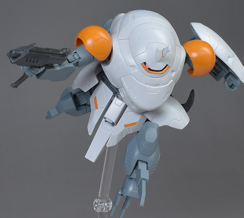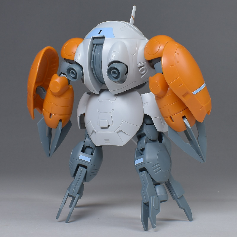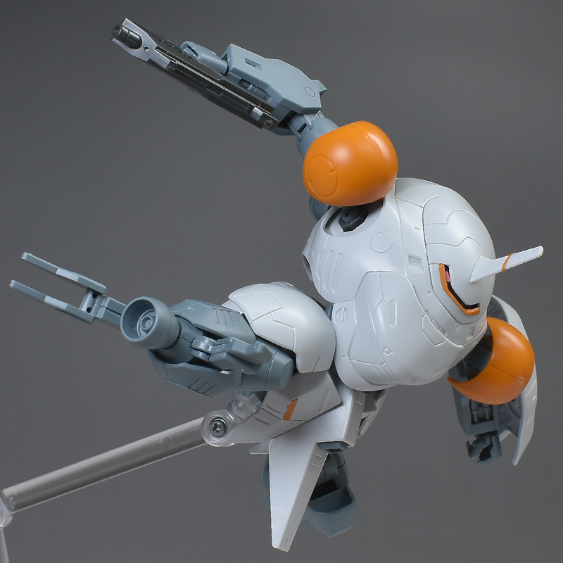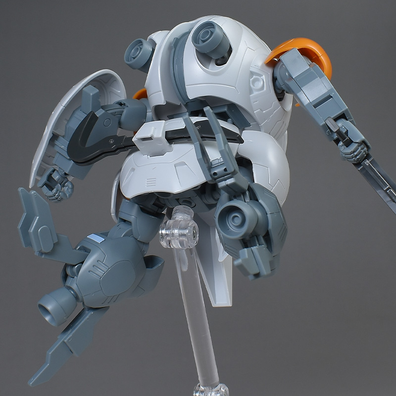 以上です。ホワイトとオレンジのカラーリングがマンロディベースの丸く可愛らしい容姿とうまくマッチしていますし、新造された箇所も造りがよく、細部まで丁寧に造形されています。小柄なキットでもモノアイの可動ギミックもしっかりと再現されていますし、シールド裏のモールドや腕部、脚部などの造りも細かくて良いですね。
