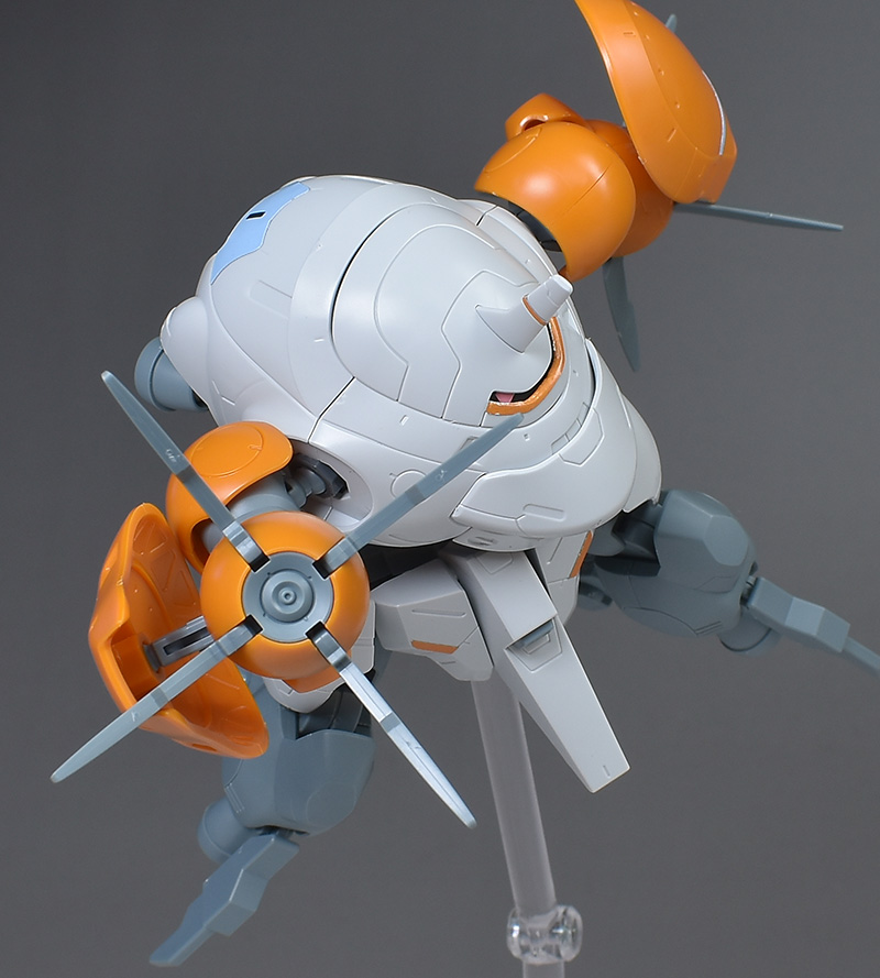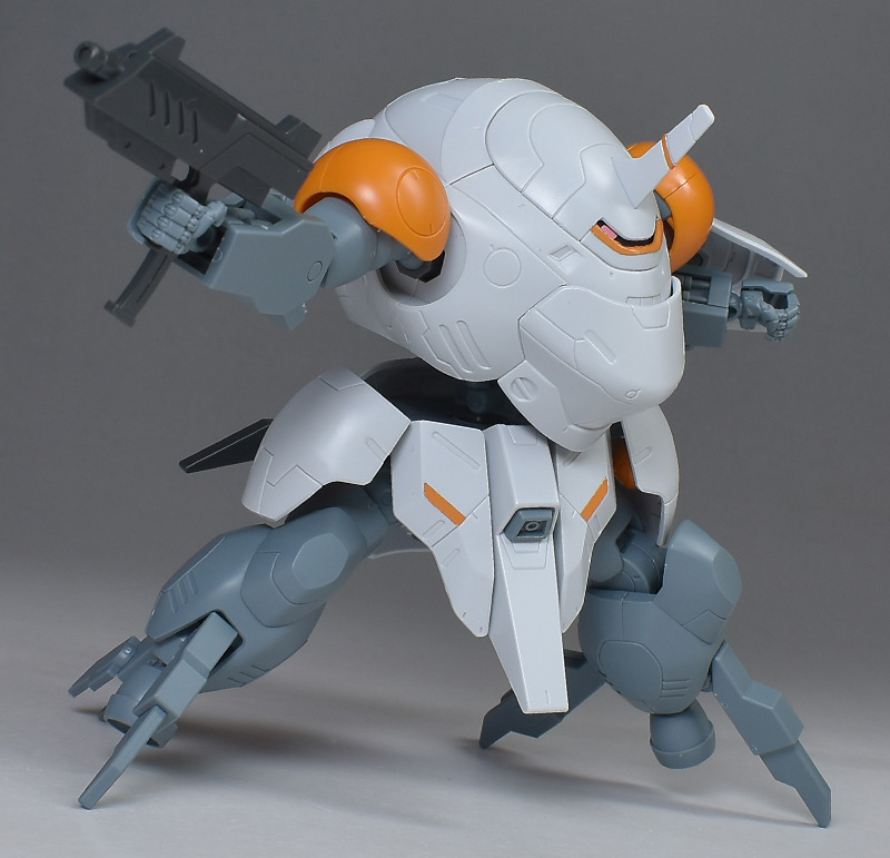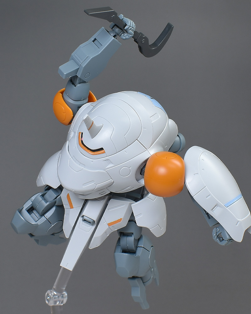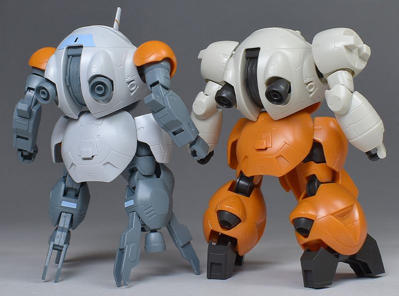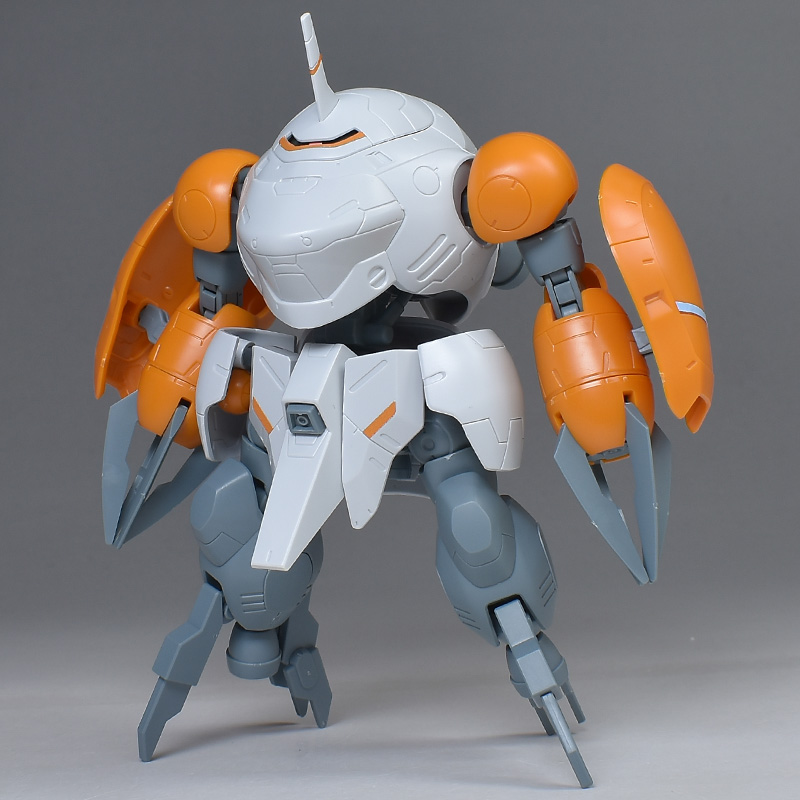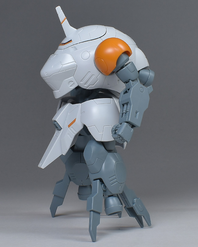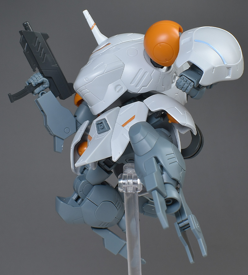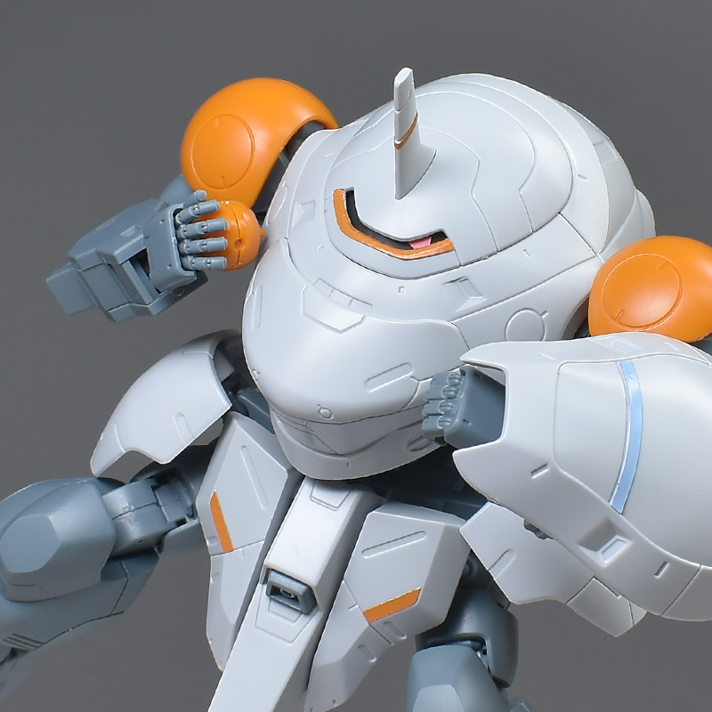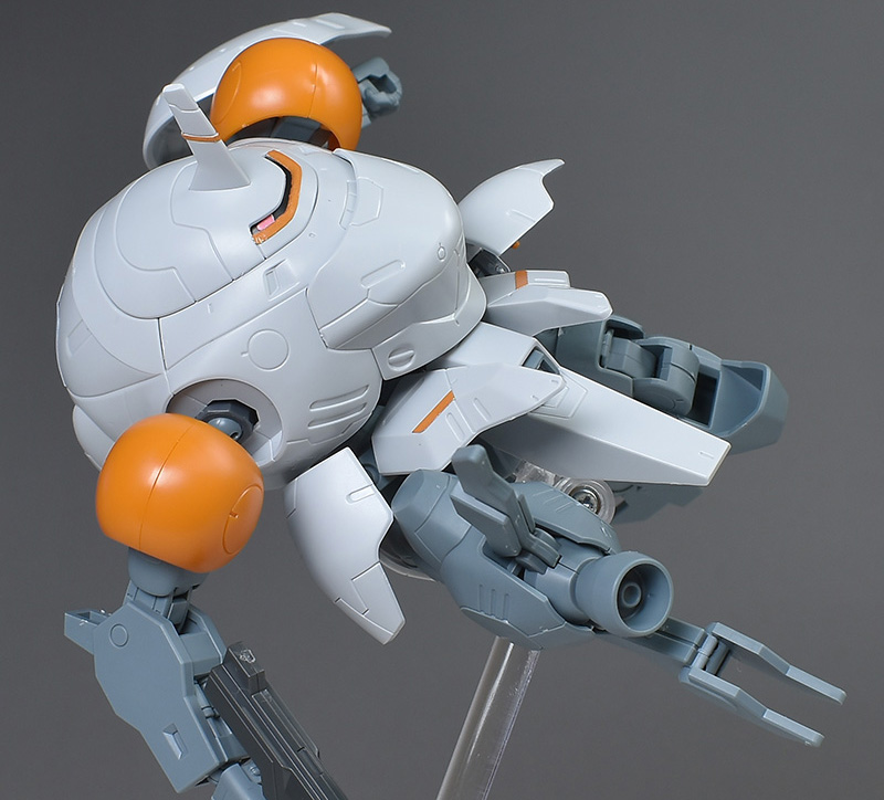 以上です。ホワイトとオレンジのカラーリングがマンロディベースの丸く可愛らしい容姿とうまくマッチしていますし、新造された箇所も造りがよく、細部まで丁寧に造形されています。小柄なキットでもモノアイの可動ギミックもしっかりと再現されていますし、シールド裏のモールドや腕部、脚部などの造りも細かくて良いですね。