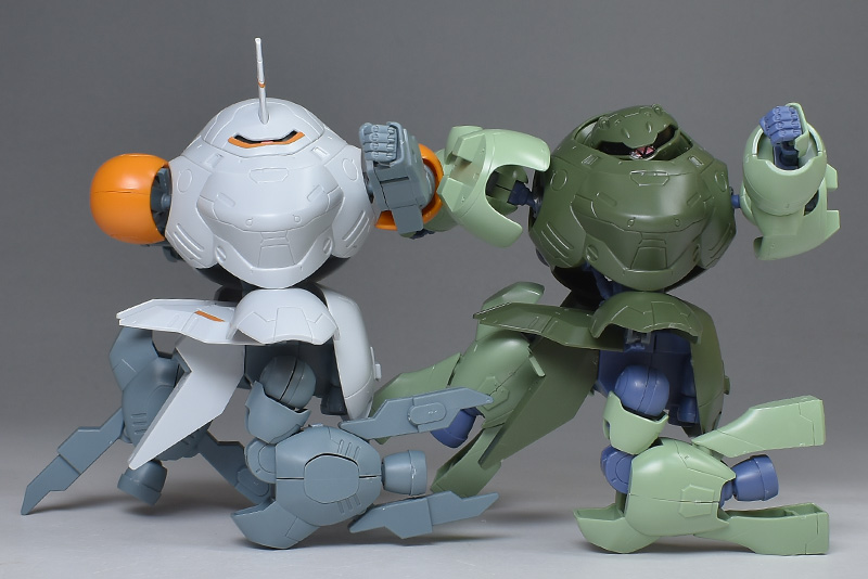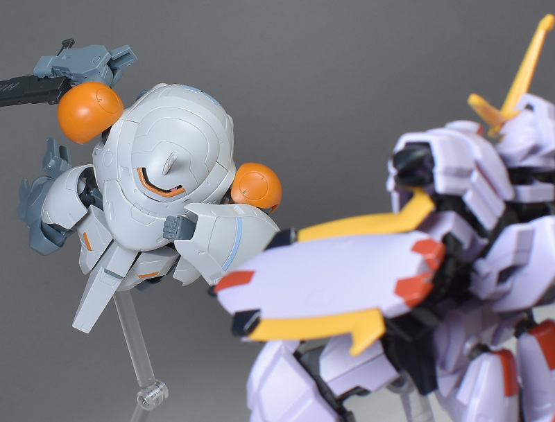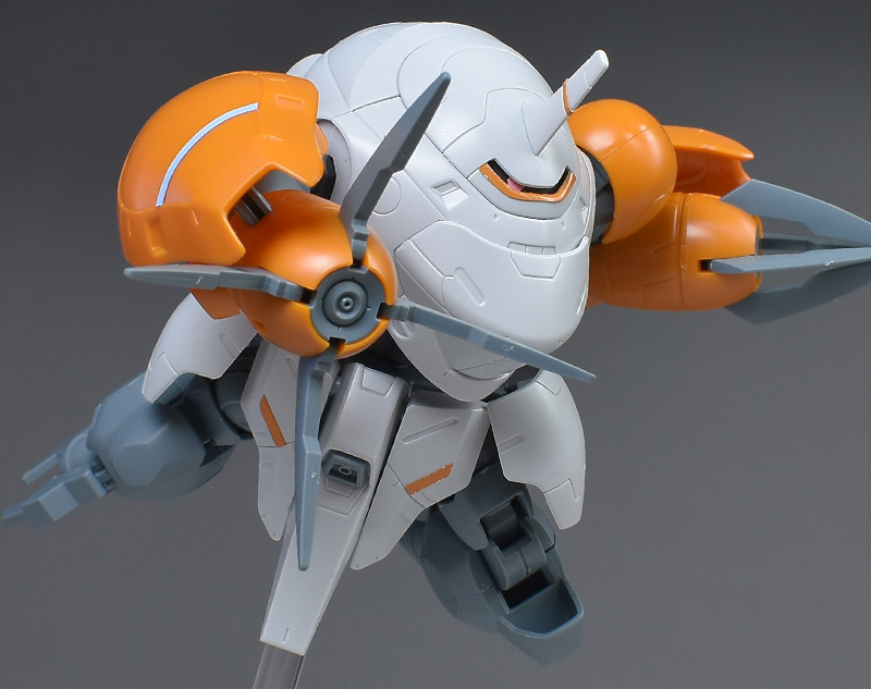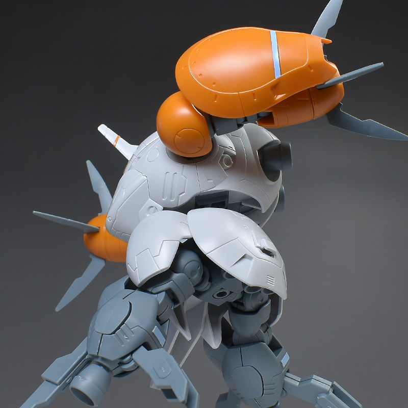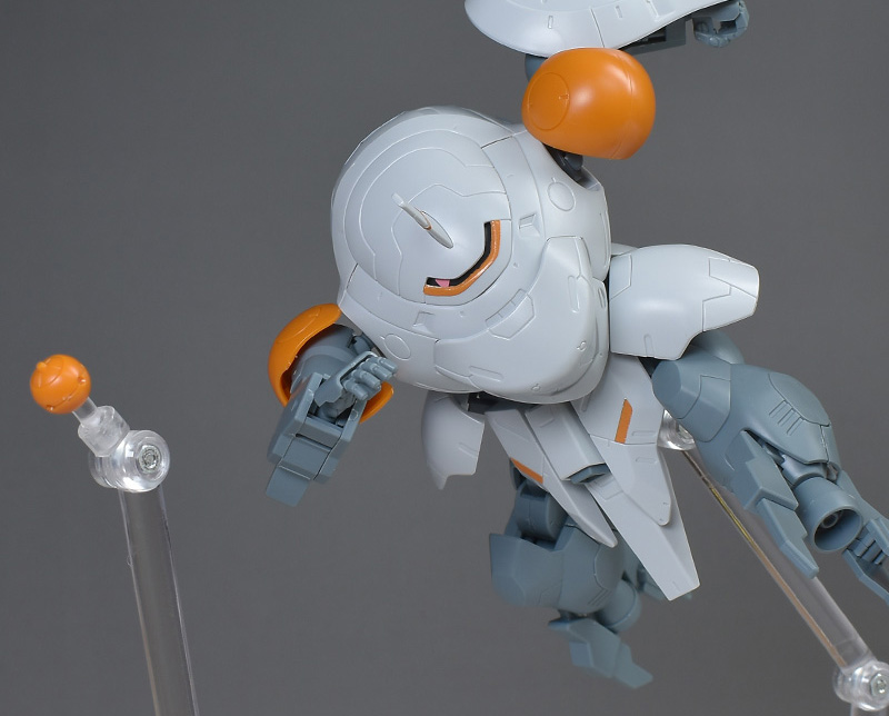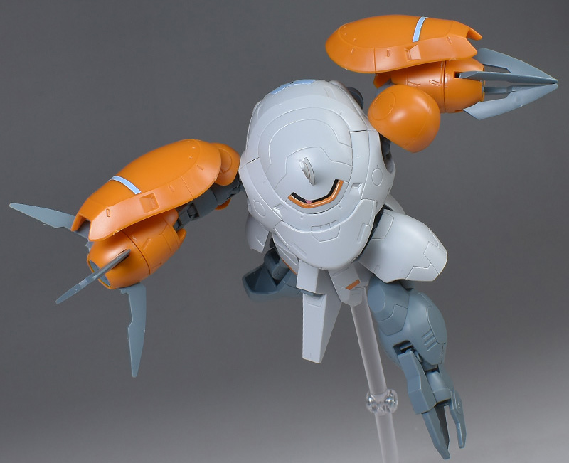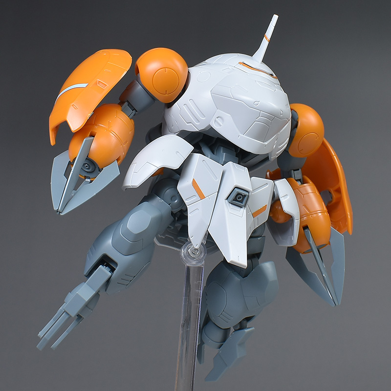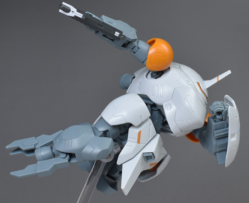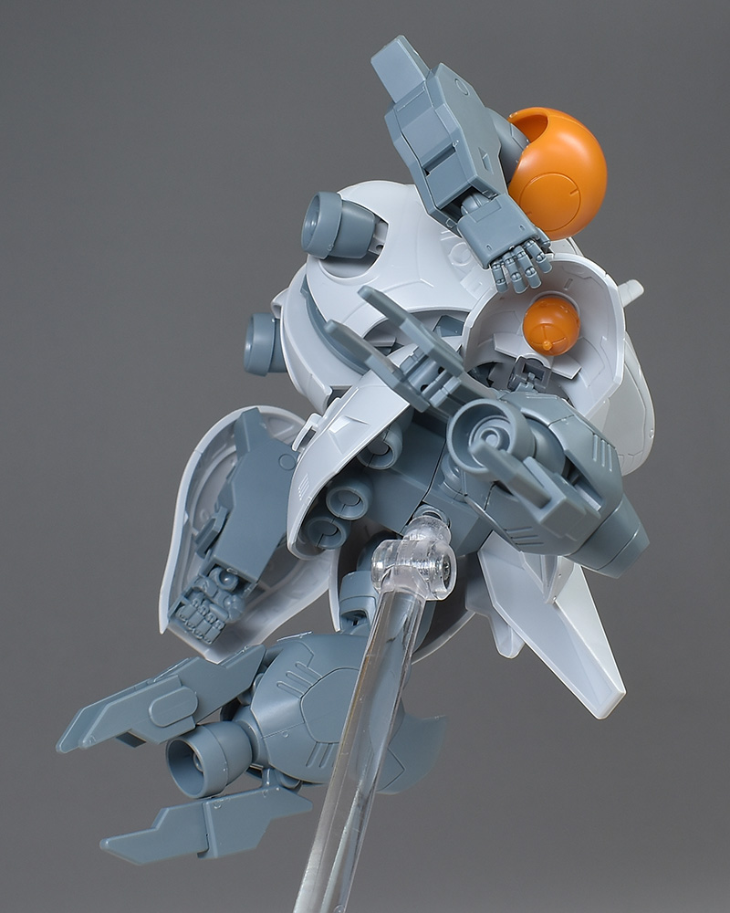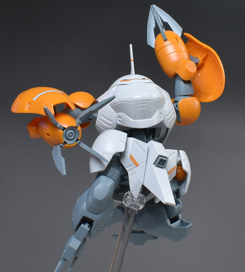 以上です。ホワイトとオレンジのカラーリングがマンロディベースの丸く可愛らしい容姿とうまくマッチしていますし、新造された箇所も造りがよく、細部まで丁寧に造形されています。小柄なキットでもモノアイの可動ギミックもしっかりと再現されていますし、シールド裏のモールドや腕部、脚部などの造りも細かくて良いですね。