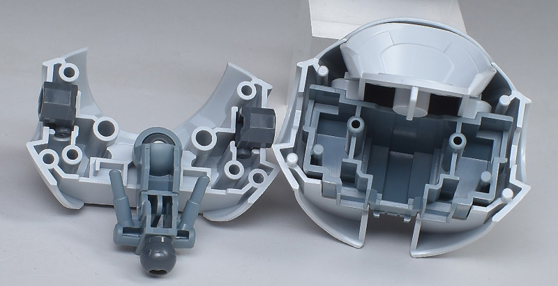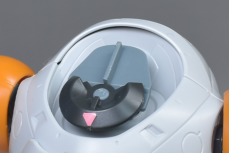 メット部を外すと内部からモノアイ用の装甲が露出。この部分にはモノアイの可動ギミックが内蔵されており、マンロディの首周りの溝がうまく有効活用されています。