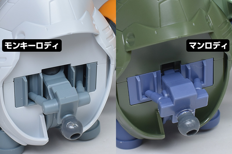 頭部。額の1本アンテナとスリット状のモノアイが特徴的に造形。マンロディがグシオンのような丸みのある容姿をしているのに対し、モンキロディは胴体部に埋め込まれた状態で固定式。胴体部に沿った山型の頭部が新規パーツを用いて再現されています。モノアイスリット下のモールドはオレンジのシールでの色分け。
