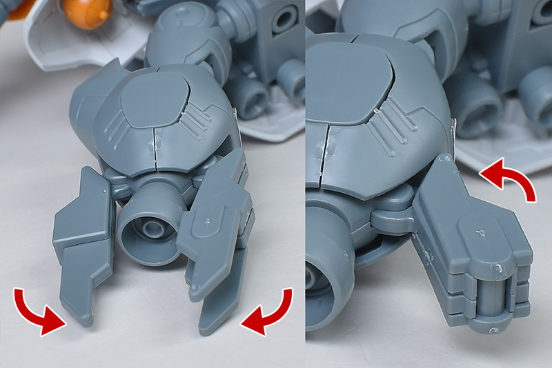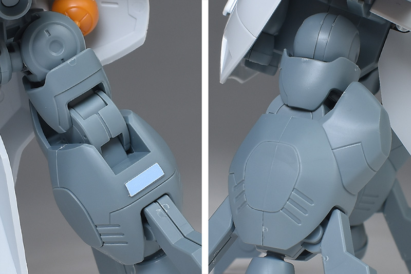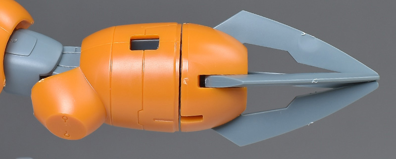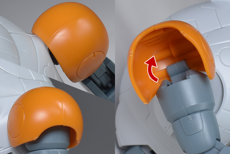 オレンジショルダー(肩部アーマー)は前後の2枚パーツ構成。上部は合わせ目があるのか段落ちモールド化されているのか細かくて確認が難しいですね。肩内部とはヒンジ接続で上下への展開が可能です。