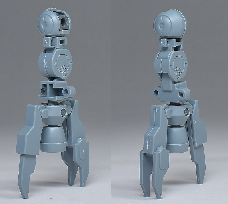 脚部。膝関節から上はマンロティと同形状ですが、膝から下がモンキーロディ用に新造。特にソールはフレームクローのような細くシャープな装甲に変化しています。後部モールドはライトブルーのシールでの色分け。
