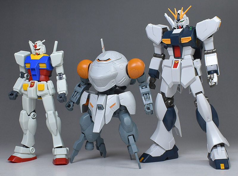 HGUC RX-78-2ガンダム(リバイブ版)、HGUCνガンダム(ファンネルなし)と並べて大きさを確認。RX-78-2とほぼ同サイズ程度になります。HGとしては中間か小柄な部類。