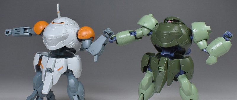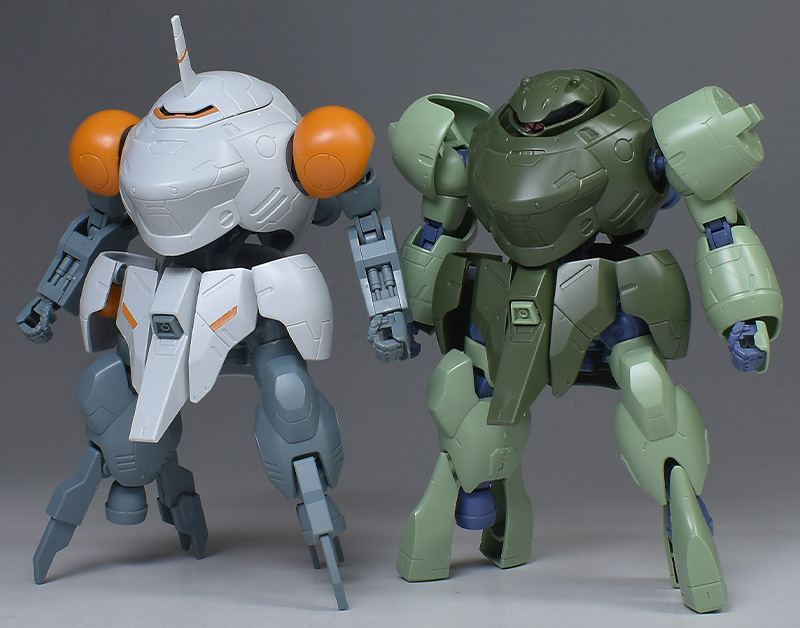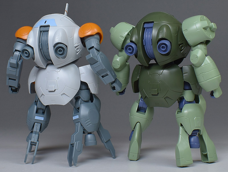 HG鉄華団コンプリートセットに付属のランドマンロディとも並べて。カラーリングは似ていますが、モンキーロディは白成形色が少し純白に近い色味になっています。