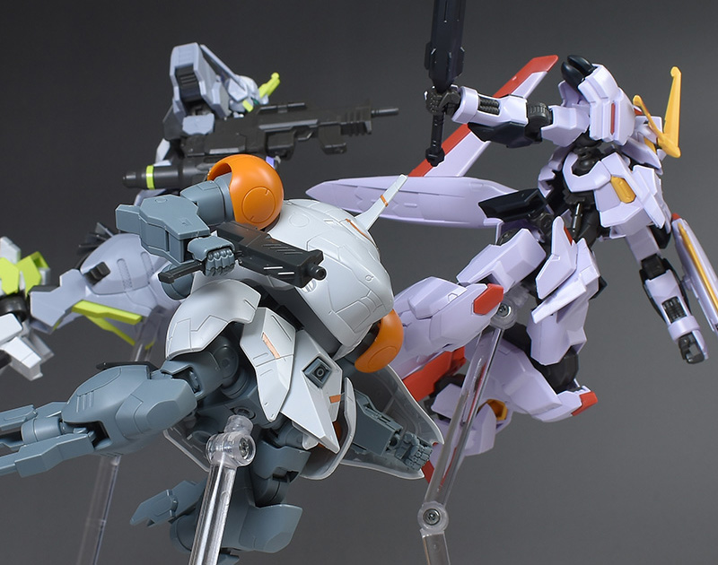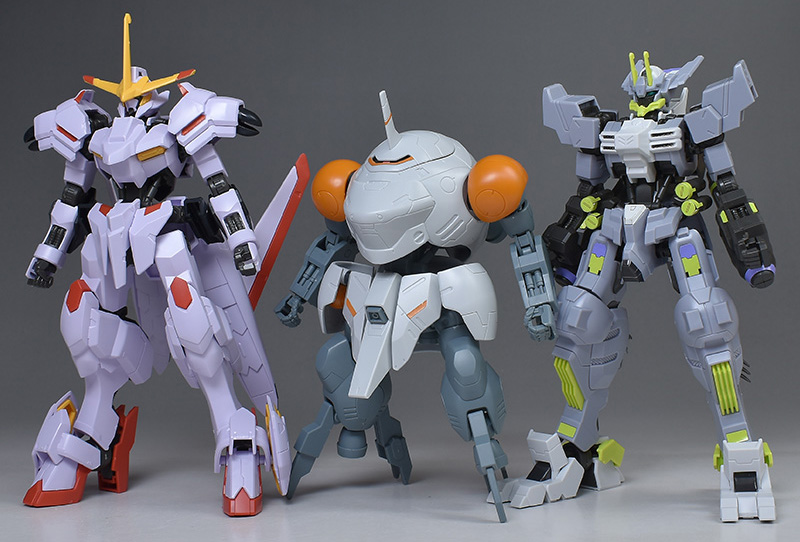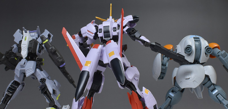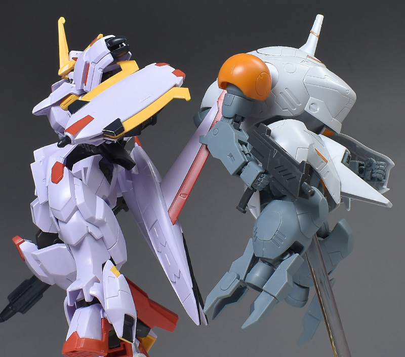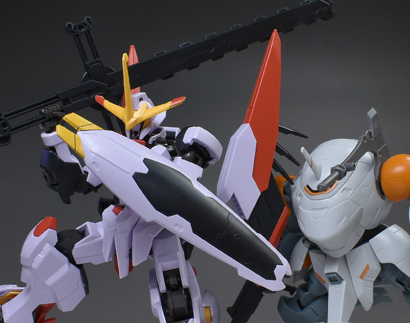 劇中で交戦、共闘したHGガンダム端白星、HGガンダムアスモデウスと並べて。3体組み合わせてハラエル戦を再現しても面白いかと。