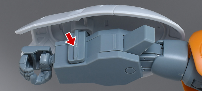 シールドはジョイントパーツを前腕後部に組み付けて装備します。横長のダボでしっかり固定されるので外れたりすることはありません。両前腕にマウント可能です。